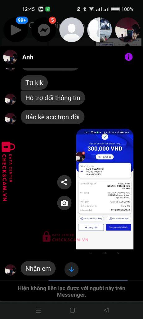 Scammer Alert: NGUYEN XUAN MOI Reported: November 16, 2024 Scammer Information Full Name: NGUYEN XUAN MOI Payment Gate: mb bank Payment Account: 0001103046868 Category: Marketplace scams Source: Checkscam Evidence Files Report Description scarm acc Comments Your comment Add Comment No comments yet. Be the first to share your experience with this scammer.