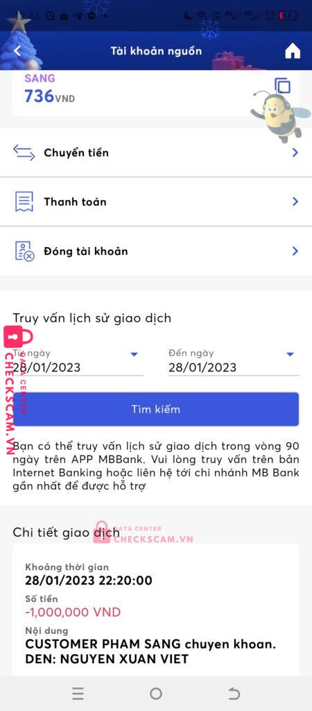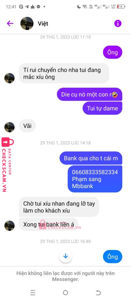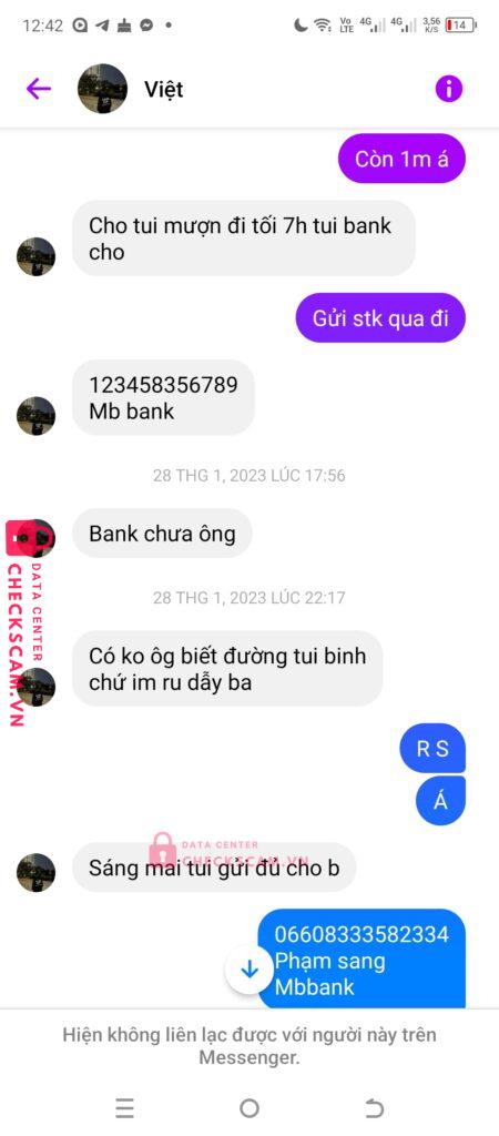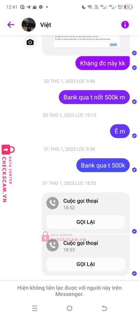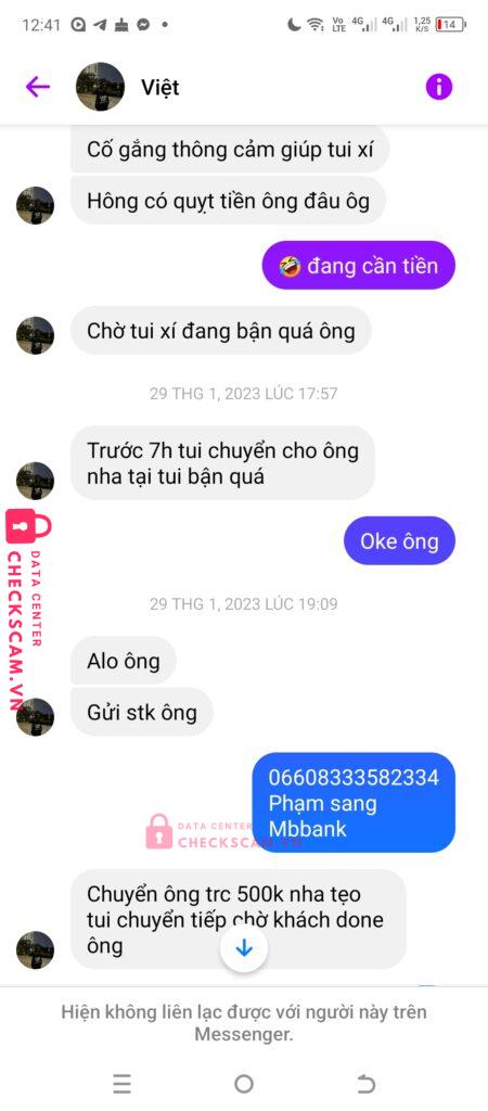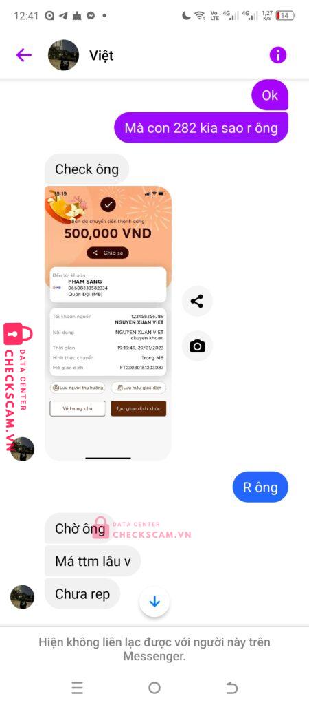 Diễn biến vụ việc như sau: thanh niên này vào ngày 28/1/2023 ngỏ ý mình mượn tiền 1 triệu.Mình suy nghỉ rồi nghỉ cũng không bạn bè cho nó mượn rồi trả và chuyển khoản nó 1 triệu vào ngày 28/1/2023 vào lúc 22:22 giờ đêm.Thanh niên này hứa hẹn sáng mai trả đủ nhưng mà sáng hôm sau ko thấy trả thế nên mình mới kêu chuyển khoản trả nợ và hắn kêu tối chuyển. đến tối lúc 19 giờ 19 phút ngày 29/1/2023 hắn chuyển khoản mình đúng 500 k và còn nợ mình 500 k tiền mượn.Xong đến ngày 30 trở đi mình đòi tiền nợ còn lại thì hắn ko xem ko rep đến ngày 31/1/2023 hắn chặn Facebook mình.