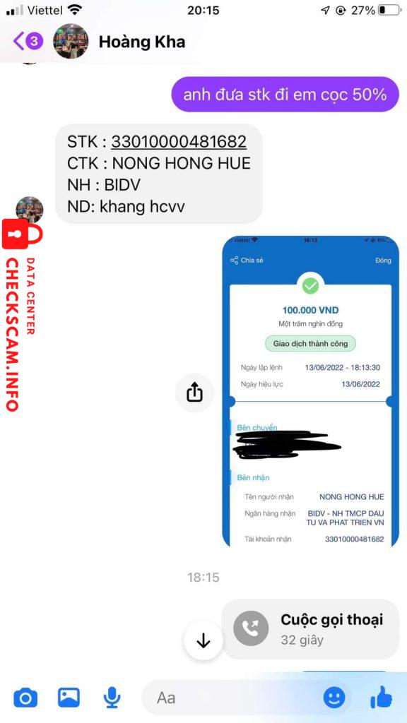 Scammer Alert: Nong Hong Hue Reported: November 16, 2024 Scammer Information Full Name: Nong Hong Hue Phone Number: 0925440761 Payment Gate: BIDV Payment Account: 33010000481682 Category: Marketplace scams Source: Checkscam Evidence Files Report Description Lừa đảo tiền cọc Comments Your comment Add Comment No comments yet. Be the first to share your experience with this scammer.