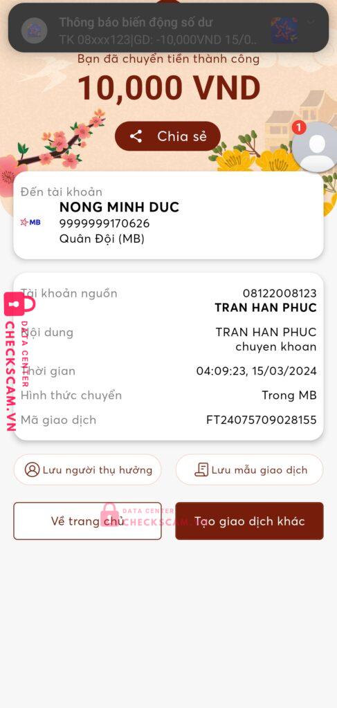Scammer Alert: NONG MINH DUC Reported: November 16, 2024 Scammer Information Full Name: NONG MINH DUC Payment Gate: Mb Bank Payment Account: 9999999170626 Category: Marketplace scams Source: Checkscam Evidence Files Report Description Scam Comments Your comment Add Comment No comments yet. Be the first to share your experience with this scammer.