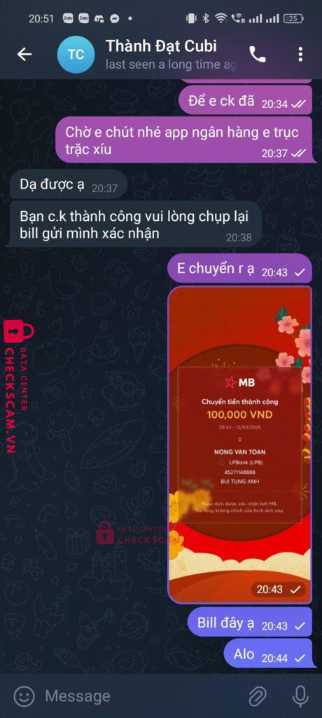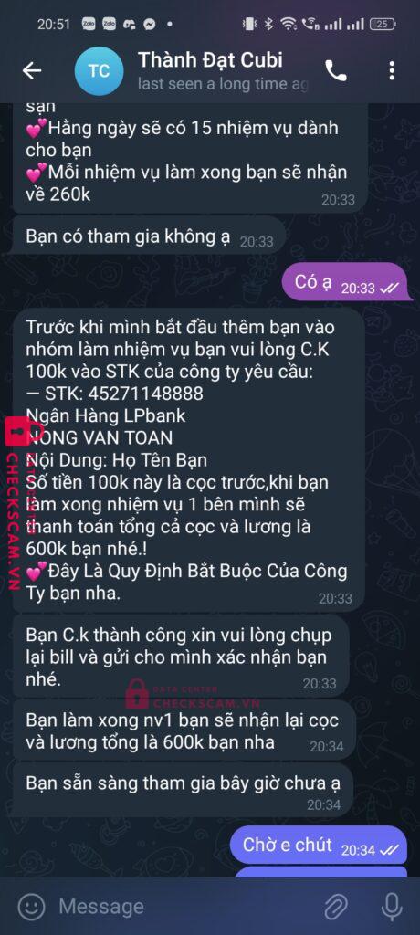 Scammer Alert: NONG VAN TOAN Reported: May 10, 2025 Scammer Information Full Name: NONG VAN TOAN Payment Gate: LPBank Payment Account: 45271148888 Category: Marketplace scams Source: Checkscam Evidence Files Report Description Lừa chuyển khoản làm nhiệm vụ Comments Your comment Add Comment No comments yet. Be the first to share your experience with this scammer.