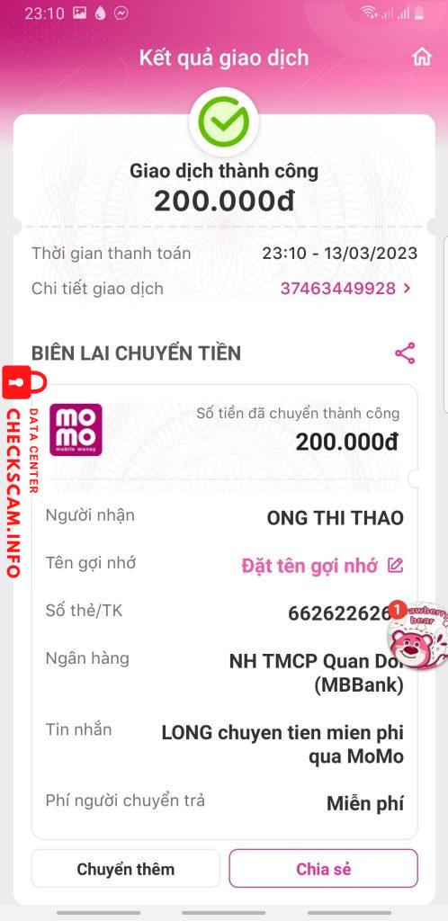 Scammer Alert: Ong thi Thao Reported: November 16, 2024 Scammer Information Full Name: Ong thi Thao Payment Gate: MB bank Payment Account: 6626226266 Category: Marketplace scams Source: Checkscam Evidence Files Report Description Scam tiền truyện, yêu cầu chuyển 50% rồi ship, sau đó chặn tài khoản và sủi Comments Your comment Add Comment No comments yet. Be the first to share your experience with this scammer.