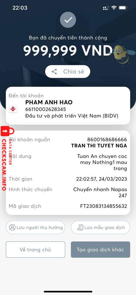 Scammer Alert: Phạm Anh Hào Reported: November 16, 2024 Scammer Information Full Name: Phạm Anh Hào Payment Gate: BIDV Payment Account: 66110002628345 Category: Marketplace scams Source: Checkscam Evidence Files Report Description Báo còn hàng, đến khi cọc xong lại lươn khươn báo chờ hàng về (hàng order), báo trả cọc ko mua nữa thì ko trả cọc Comments Your comment Add Comment No comments yet. Be the first to share your experience with this scammer.