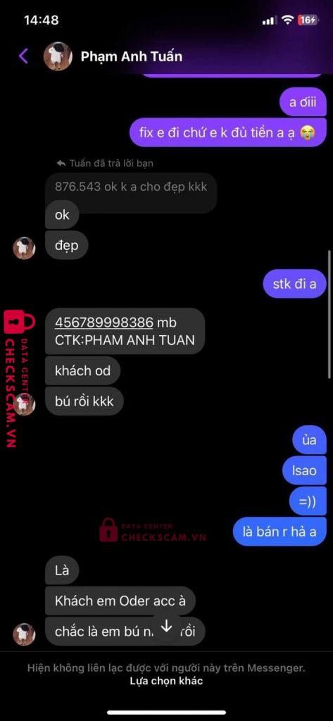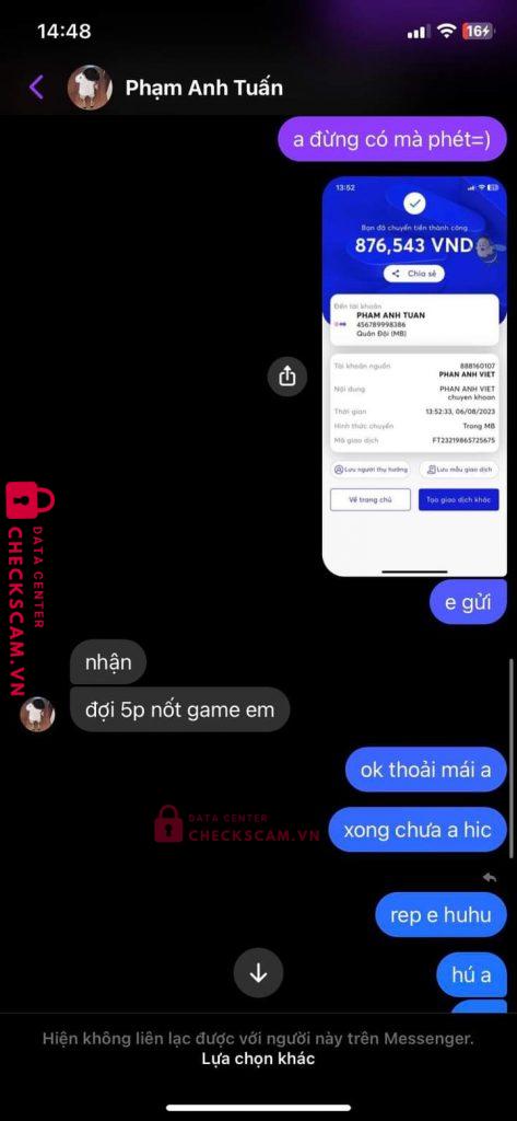 Scammer Alert: PHAM ANH TUAN Reported: November 16, 2024 Scammer Information Full Name: PHAM ANH TUAN Payment Gate: MB BANK Payment Account: 456789998386 Category: Marketplace scams Source: Checkscam Evidence Files Report Description Bank tiền xong block Comments Your comment Add Comment No comments yet. Be the first to share your experience with this scammer.