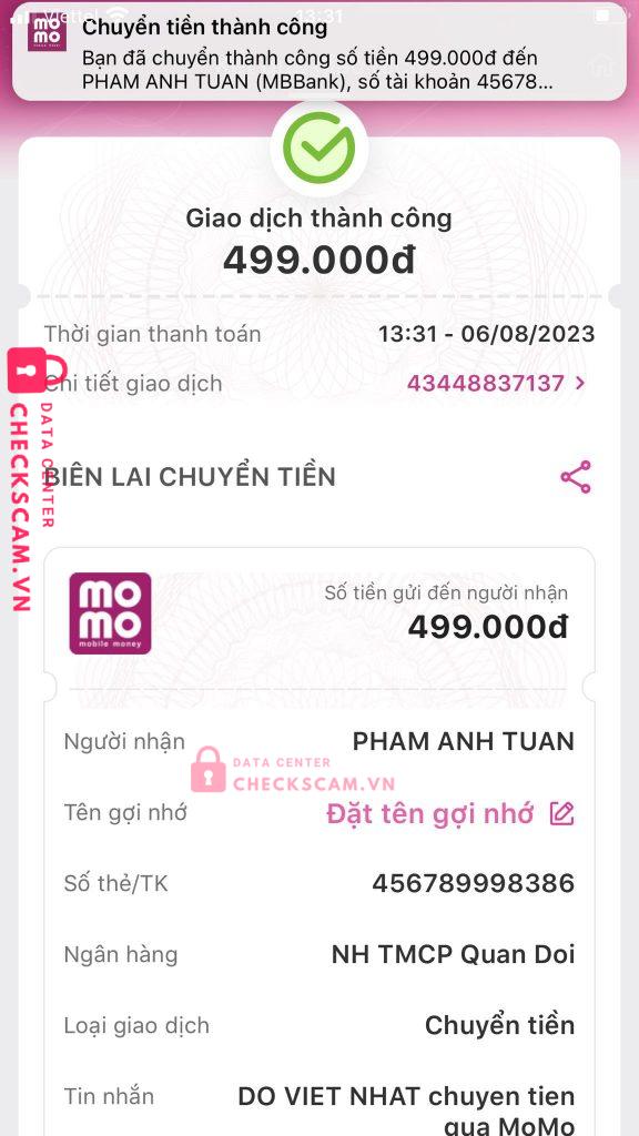 Scammer Alert: PHAM ANH TUAN Reported: November 16, 2024 Scammer Information Full Name: PHAM ANH TUAN Phone Number: 0398216036 Payment Gate: MB Bank Payment Account: 456789998386 Category: Marketplace scams Source: Checkscam Evidence Files Report Description Phạm Anh Tuấn scam 500 Comments Your comment Add Comment No comments yet. Be the first to share your experience with this scammer.