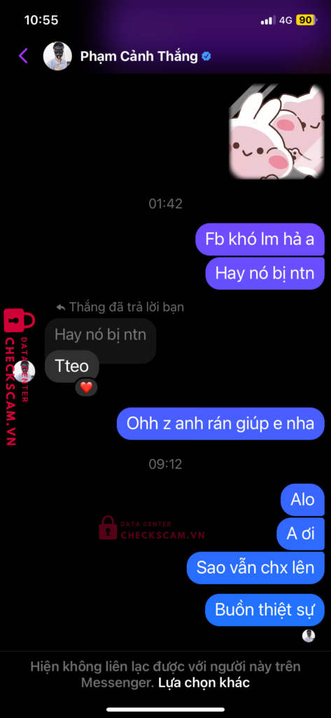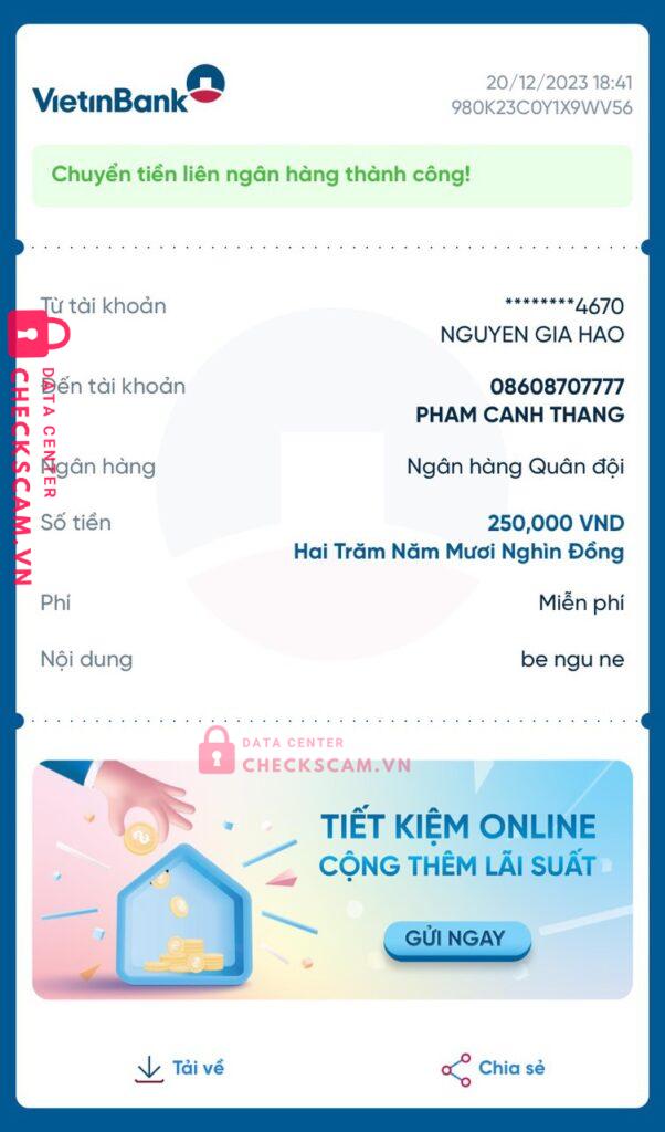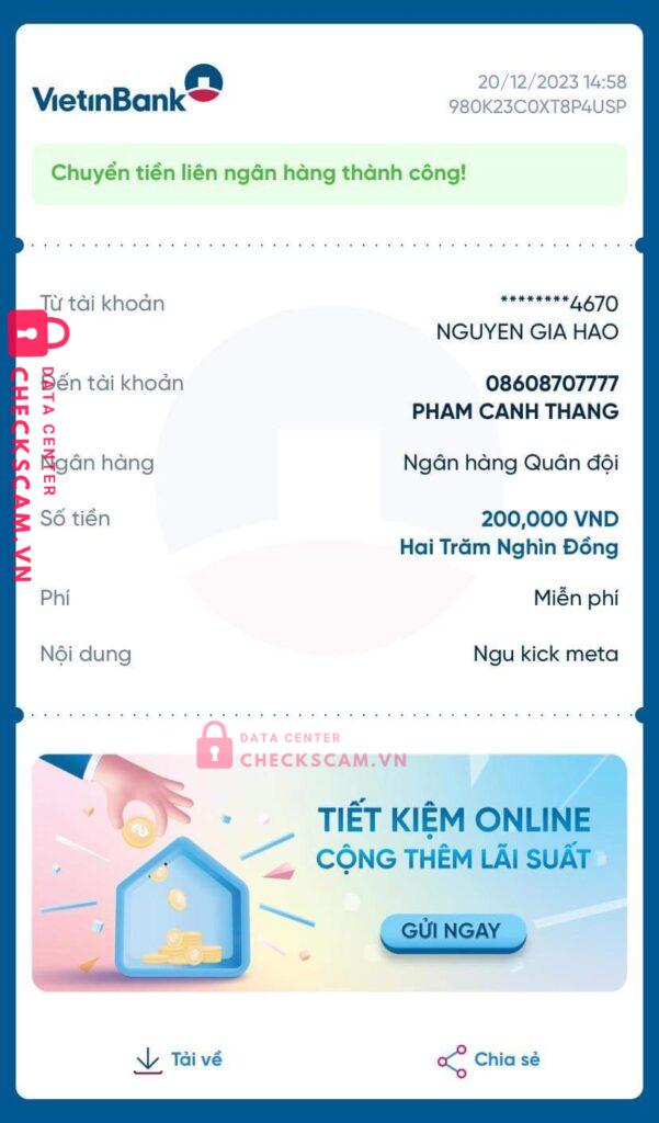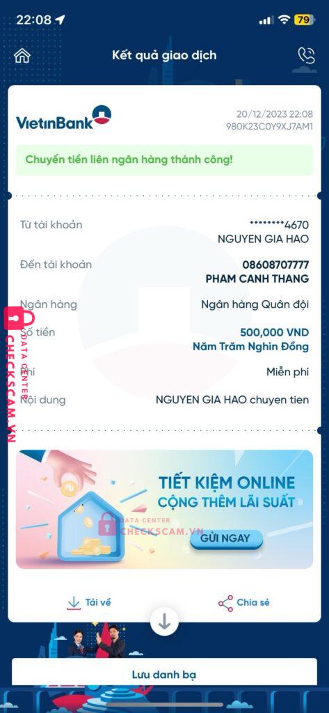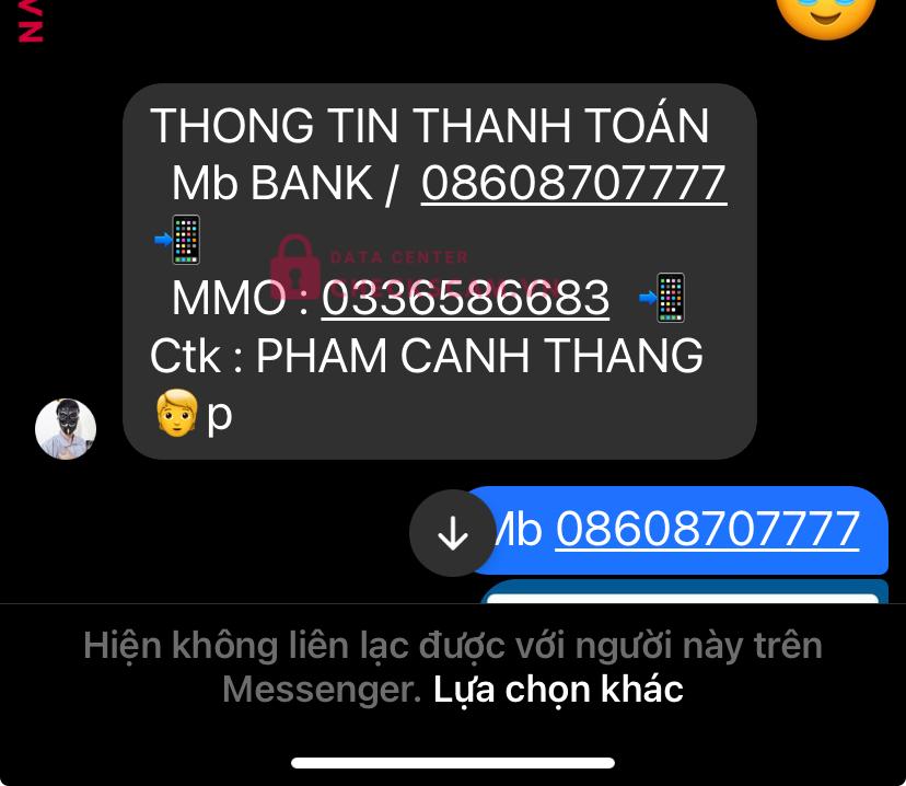 Scammer Alert: PHAM CANH THANG Reported: November 16, 2024 Scammer Information Full Name: PHAM CANH THANG Payment Gate: MB BANK VÀ MOMO Payment Account: 08608707777 Category: Marketplace scams Source: Checkscam Evidence Files Report Description Lên tick xanh mà làm không được nên block lúc đầu uy tín sao thì lại scam Comments Your comment Add Comment No comments yet. Be the first to share your experience with this scammer.