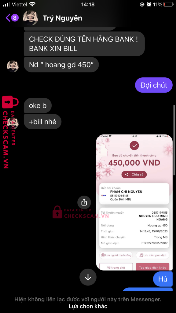 Scammer Alert: Phạm Chí Nguyên Reported: November 16, 2024 Scammer Information Full Name: Phạm Chí Nguyên Phone Number: 0935388074 Payment Gate: Mb Payment Account: 551191066145 Category: Marketplace scams Source: Checkscam Evidence Files Report Description Bị bịp 450 :(( Comments Your comment Add Comment No comments yet. Be the first to share your experience with this scammer.
