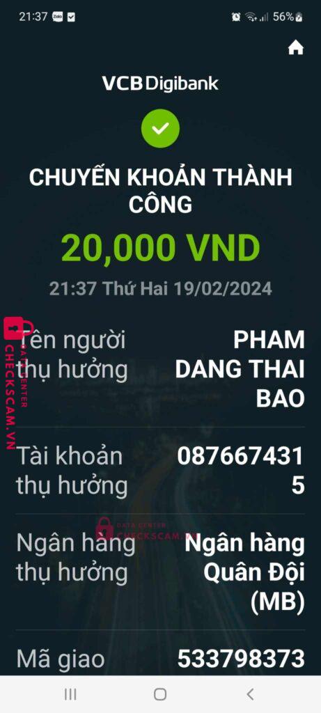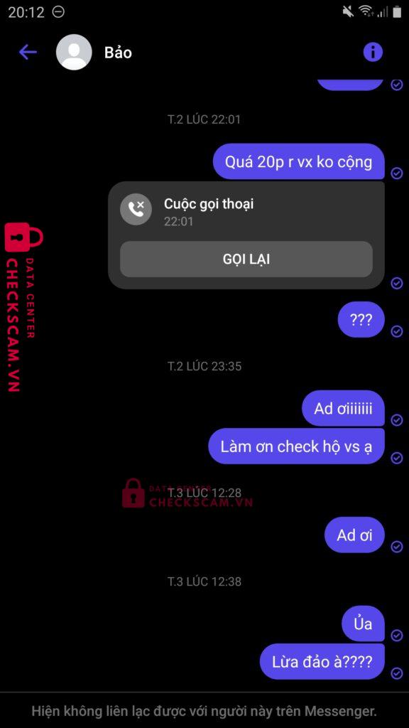 Scammer Alert: PHAM DANG THAI BAO Reported: November 16, 2024 Scammer Information Full Name: PHAM DANG THAI BAO Payment Gate: MB Payment Account: 0876674315 Category: Marketplace scams Source: Checkscam Evidence Files Report Description Đã nạp vào subngongiare.click 20k nhưng chờ cả tuần vx chưa cộng tiền và đã nhắn tin tất cả nền tảng nhưng vẫn ko reply Comments Your comment Add Comment No comments yet. Be the first to share your experience with this scammer.