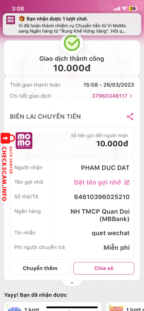 Scammer Alert: PHAM DUC DAT Reported: November 16, 2024 Scammer Information Full Name: PHAM DUC DAT Payment Gate: MBBANK Payment Account: 64610396025210 Category: Marketplace scams Source: Checkscam Evidence Files Report Description Tôi quét wechat và ổng bảo bạn xong mới quét tôi bank thì ổng bảo đợi rồi chặn luôn Comments Your comment Add Comment No comments yet. Be the first to share your experience with this scammer.