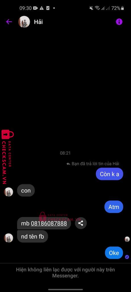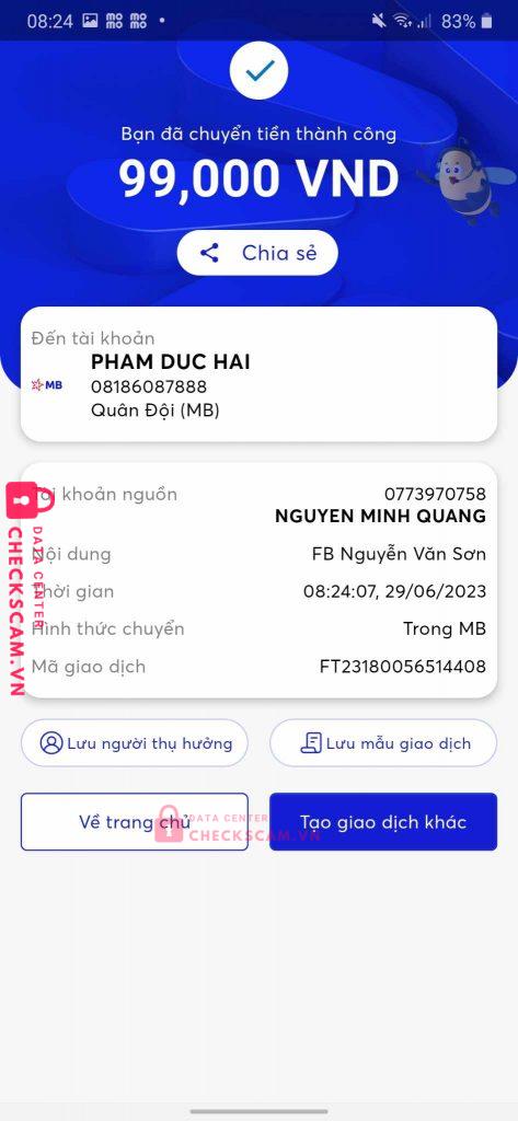 Scammer Alert: Pham Duc Hai Reported: November 16, 2024 Scammer Information Full Name: Pham Duc Hai Payment Gate: Mb bank Payment Account: 08186087888 Category: Marketplace scams Source: Checkscam Evidence Files Report Description Scam Comments Your comment Add Comment No comments yet. Be the first to share your experience with this scammer.