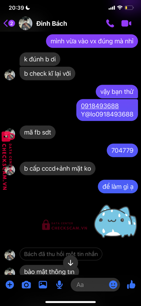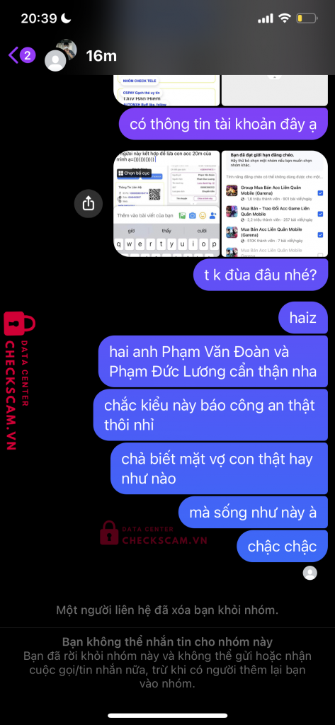 Scammer Alert: PHAM DUC LUONG Reported: November 16, 2024 Scammer Information Full Name: PHAM DUC LUONG Phone Number: 0898398232 Payment Gate: ACB Payment Account: 10237251 Category: Marketplace scams Source: Checkscam Evidence Files Report Description bạn này dùng fb admin trong nhóm kia cùng một người mua acc từ mình là Khoi Huynh lừa mình lấy acc 20m Comments Your comment Add Comment No comments yet. Be the first to share your experience with this scammer.