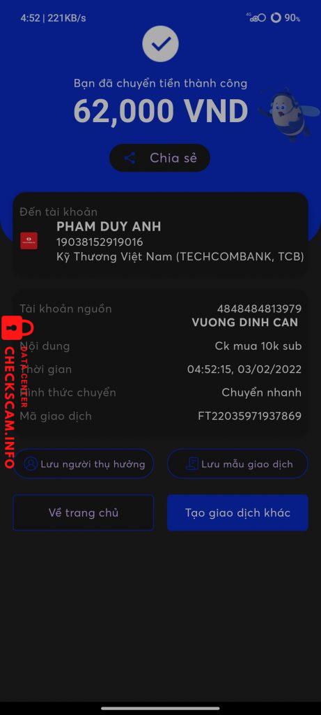Scammer Alert: Pham Duy Anh Reported: November 16, 2024 Scammer Information Full Name: Pham Duy Anh Payment Gate: Techcombank Payment Account: 19038152919016 Category: Marketplace scams Source: Checkscam Evidence Files Report Description Thằng này có hơn 100k củng lừa nè m.n ơi M.n nên cận thận ạ Comments Your comment Add Comment No comments yet. Be the first to share your experience with this scammer.