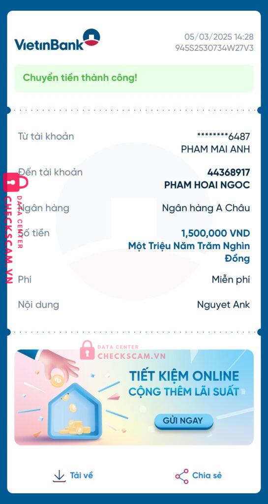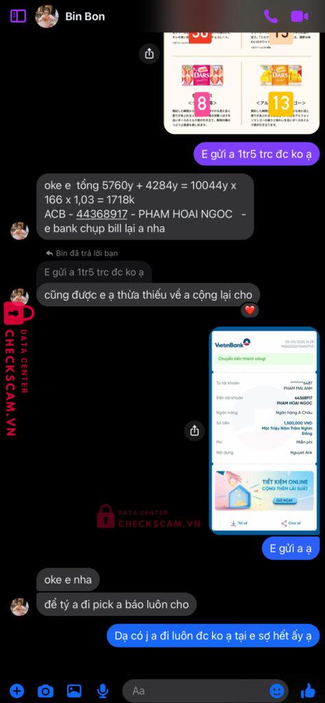 Scammer Alert: PHAM HOAI NGOC Reported: March 7, 2025 Scammer Information Full Name: PHAM HOAI NGOC Payment Gate: ACB Payment Account: 44368917 Category: Marketplace scams Source: Checkscam Evidence Files Report Description Nhờ mua socola hộ, nhận tiền xong sủi luôn. Tìm bằng acc fb khác vẫn đc nhưng lại bị chặn tiếp Comments Your comment Add Comment No comments yet. Be the first to share your experience with this scammer.