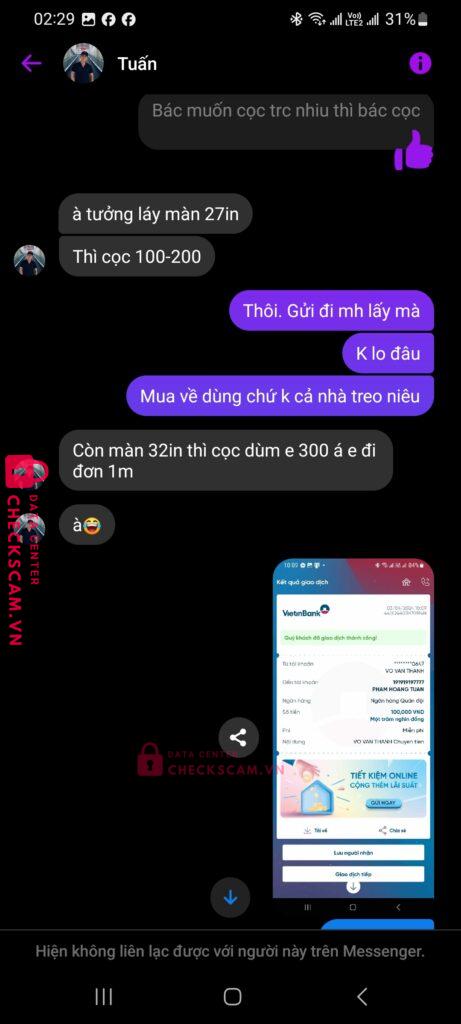 Scammer Alert: Phạm Hoàng Tuấn Reported: November 16, 2024 Scammer Information Full Name: Phạm Hoàng Tuấn Payment Gate: Mb Bank Payment Account: 1919197777 Category: Marketplace scams Source: Checkscam Evidence Files Report Description Lừa đảo cọc mua màn hình pc Comments Your comment Add Comment No comments yet. Be the first to share your experience with this scammer.