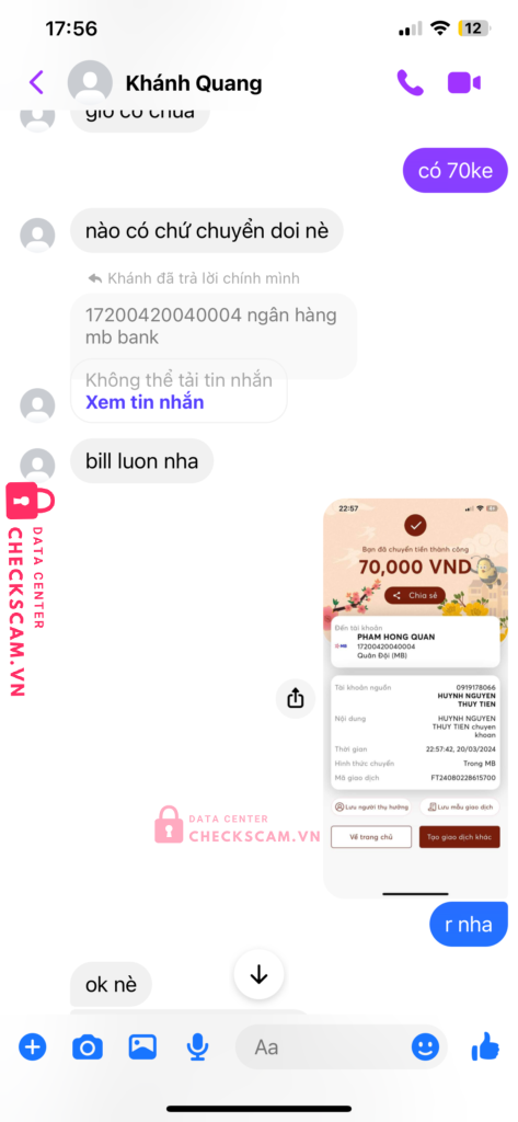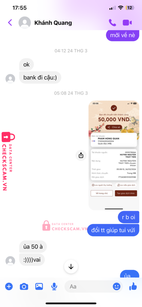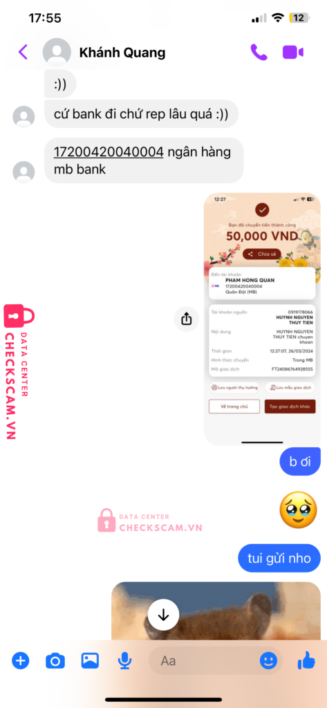 Scammer Alert: PHAM HONG QUAN Reported: November 16, 2024 Scammer Information Full Name: PHAM HONG QUAN Payment Gate: MB Bank Payment Account: 17200420040004 Category: Marketplace scams Source: Checkscam Evidence Files Report Description Ẻm nhắn tin dễ thương quá trời, cho check acc chơi đủ thứ luôn nên t ko gdtg mà ck ai ngờ… Comments Your comment Add Comment No comments yet. Be the first to share your experience with this scammer.