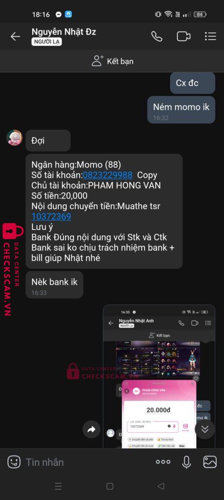 Scammer Alert: PHAM HONG VAN Reported: November 16, 2024 Scammer Information Full Name: PHAM HONG VAN Payment Gate: MoMo Payment Account: 0823229988 Category: Marketplace scams Source: Checkscam Evidence Files Report Description Gửi tiền rồi mà vài ngày không thấy rep Comments Your comment Add Comment No comments yet. Be the first to share your experience with this scammer.