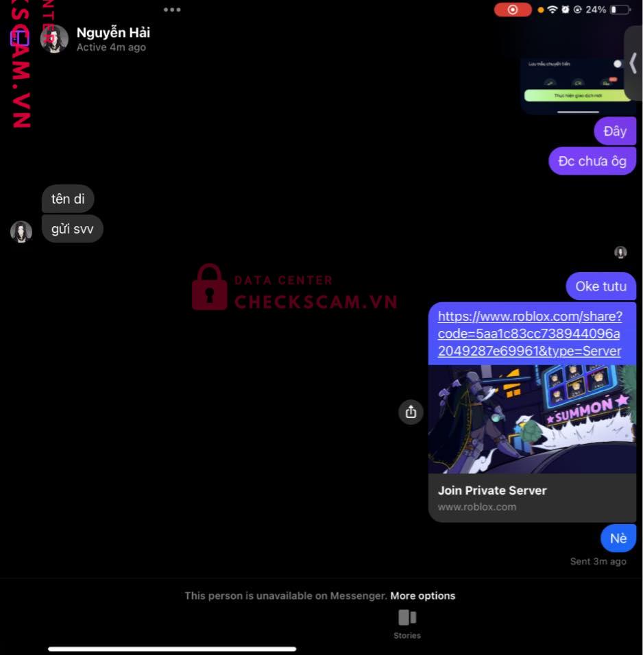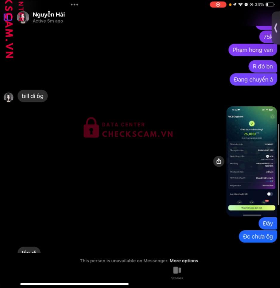 Scammer Alert: PHAM HONG VAN Reported: March 7, 2025 Scammer Information Full Name: PHAM HONG VAN Payment Gate: ngân hàng á châu Payment Account: 0973105012 Category: Marketplace scams Source: Checkscam Evidence Files Report Description bạn tôi mua cho tôi gamepass với giá 75k mà đến khi gift gamepass thì chặn facebook Comments Your comment Add Comment No comments yet. Be the first to share your experience with this scammer.