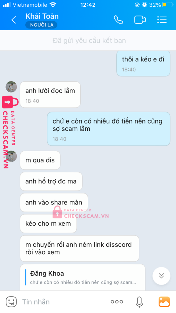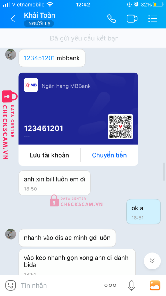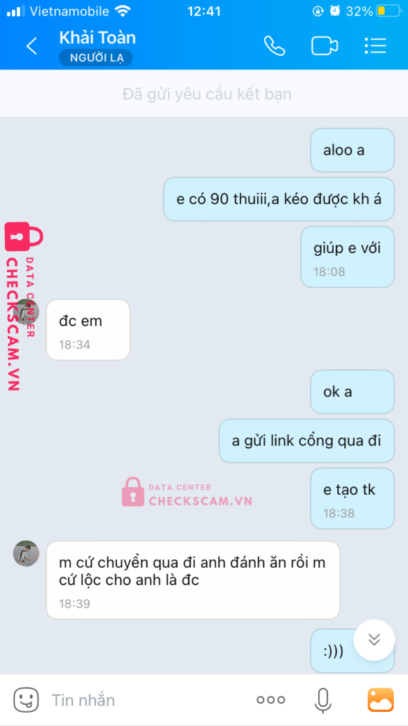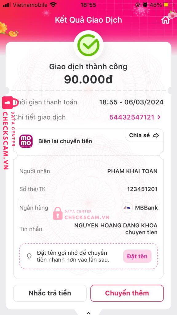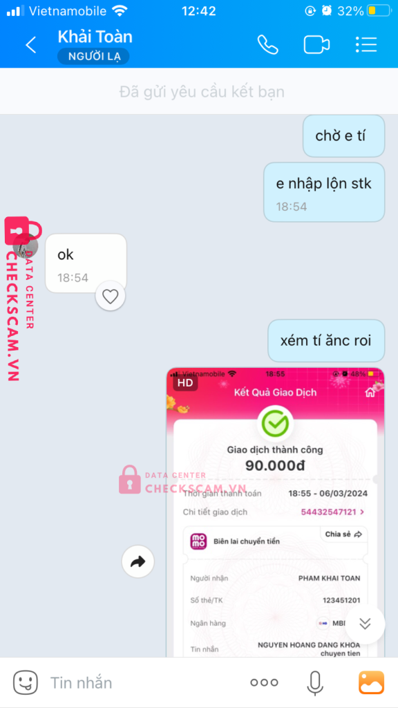 Scammer Alert: Phạm Khải Toàn Reported: November 16, 2024 Scammer Information Full Name: Phạm Khải Toàn Payment Gate: MB Bank Payment Account: 123451201 Category: Marketplace scams Source: Checkscam Evidence Files Report Description ae ai có kéo tài xỉu thì né thằng này ra nha,ae gửi tiền xong là nó kh rep tn ae đâu. Comments Your comment Add Comment No comments yet. Be the first to share your experience with this scammer.
