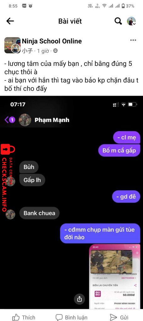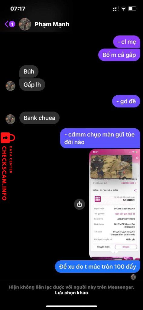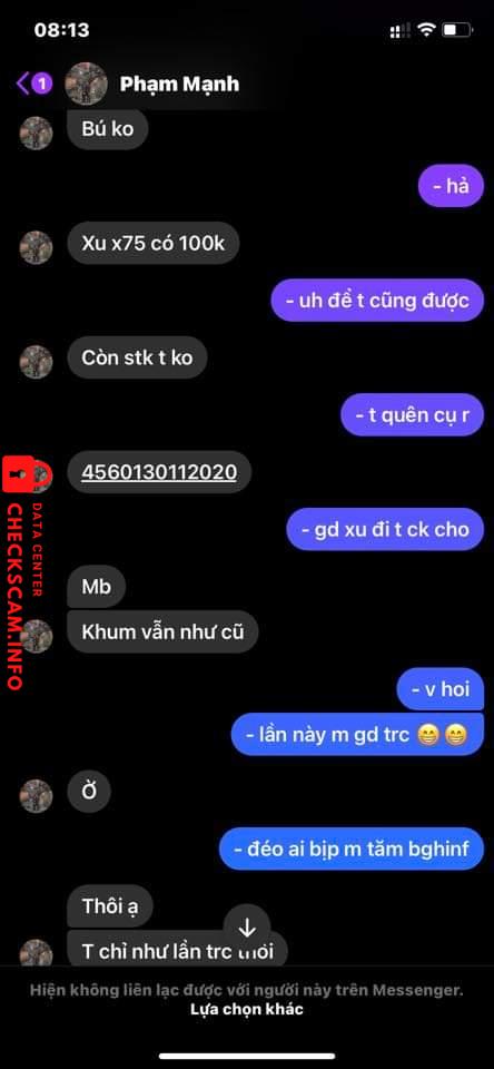 Scammer Alert: Pham Minh Manh Reported: November 16, 2024 Scammer Information Full Name: Pham Minh Manh Payment Gate: momo Payment Account: 4560130112020 Category: Marketplace scams Source: Checkscam Evidence Files Report Description Lừa đảo bán xu trong game, chuyển khoản xong thì block Comments Your comment Add Comment No comments yet. Be the first to share your experience with this scammer.
