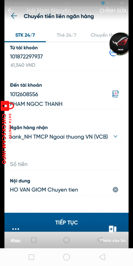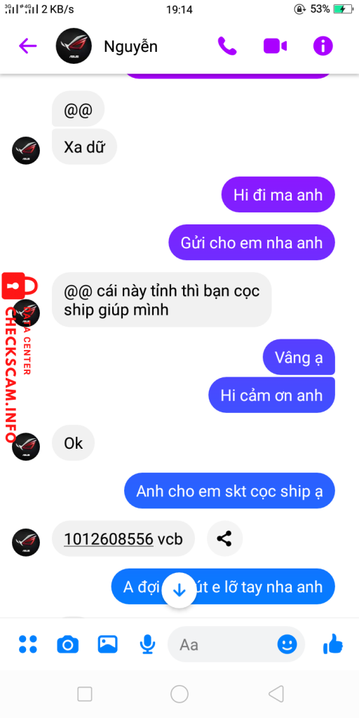 Scammer Alert: Pham Ngoc Thanh Reported: November 16, 2024 Scammer Information Full Name: Pham Ngoc Thanh Payment Gate: Vietcombank Payment Account: 1012608556 Category: Marketplace scams Source: Checkscam Evidence Files Report Description Lừa tiền khách hàng Comments Your comment Add Comment No comments yet. Be the first to share your experience with this scammer.