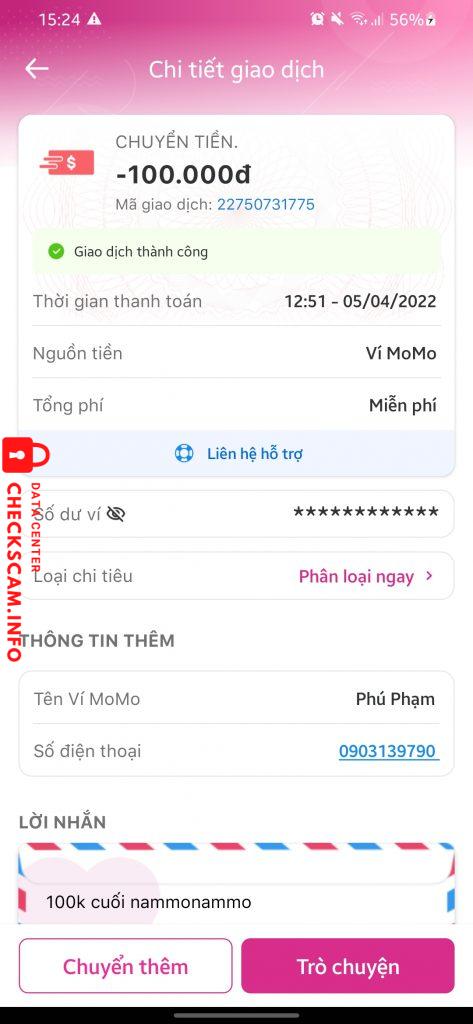 Scammer Alert: Phạm Phú Reported: November 16, 2024 Scammer Information Full Name: Phạm Phú Phone Number: 0903139790 Payment Gate: Momo Payment Account: 0903139790 Category: Marketplace scams Source: Checkscam Evidence Files Report Description dm pvgp trùm scam trả t 100k Comments Your comment Add Comment No comments yet. Be the first to share your experience with this scammer.