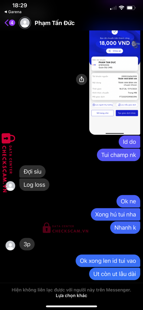 Scammer Alert: Pham Tan Duc Reported: November 16, 2024 Scammer Information Full Name: Pham Tan Duc Payment Gate: Mb bank Payment Account: 6118102006 Category: Marketplace scams Source: Checkscam Evidence Files Report Description Mong ad duyet giup e vs a no scam e Comments Your comment Add Comment No comments yet. Be the first to share your experience with this scammer.