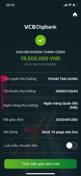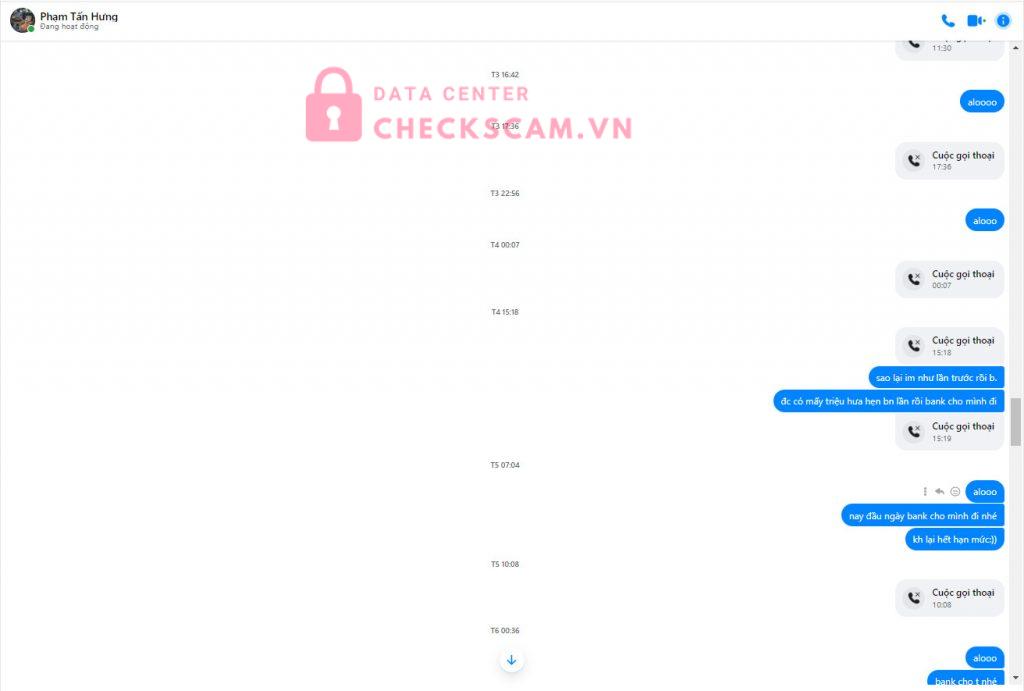 tôi có mua page của phạm tấn hưng tổng bill là 19tr500k. nhưng lúc tôi nhận page thì lỗi page hết nên tôi trả lại page và bắt hoàn tiền. thì ô kia hoàn có 5tr còn lại 14tr500k thì hẹn ngày này ngày khác, đến ngày lại im như hết gọi nhắn kh đc trong mấy tuần. thì tôi ms biết bị scam. nhờ ad min check để cho nó khỏi đi lừa nhưng người khác. cảm ơn