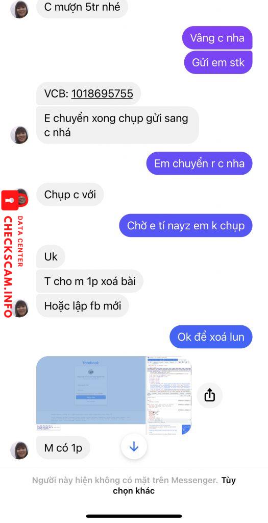 Scammer Alert: Phạm Thị Hải Reported: November 16, 2024 Scammer Information Full Name: Phạm Thị Hải Payment Gate: Vietcombank Payment Account: 1018695755 Category: Marketplace scams Source: Checkscam Evidence Files Report Description Hack Facebook người khác để lừa vay chuyển tiền rồi chặn Comments Your comment Add Comment No comments yet. Be the first to share your experience with this scammer.