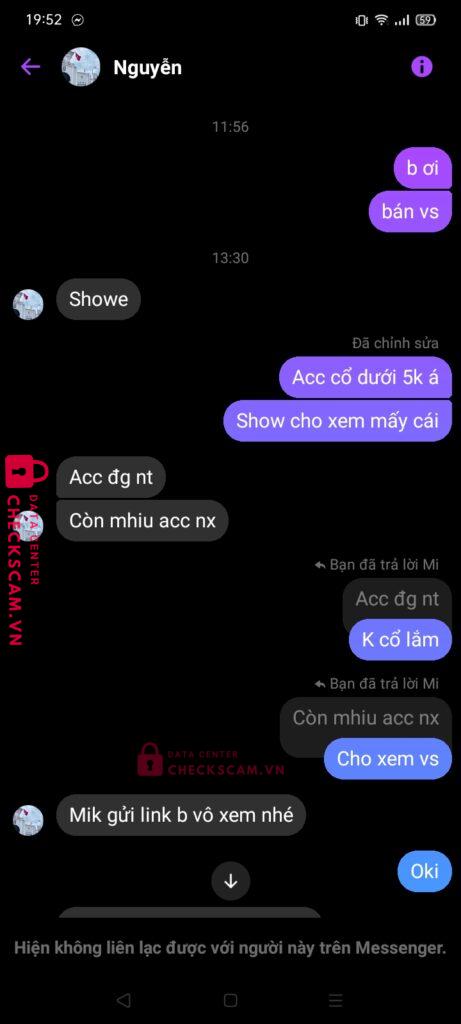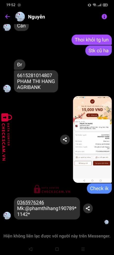 Scammer Alert: PHAM THI HANG Reported: November 16, 2024 Scammer Information Full Name: PHAM THI HANG Payment Gate: AGRIBANK Payment Account: 6615281014807 Category: Marketplace scams Source: Checkscam Evidence Files Report Description Mua acc cổ fb chuyển tiền r block Comments Your comment Add Comment No comments yet. Be the first to share your experience with this scammer.
