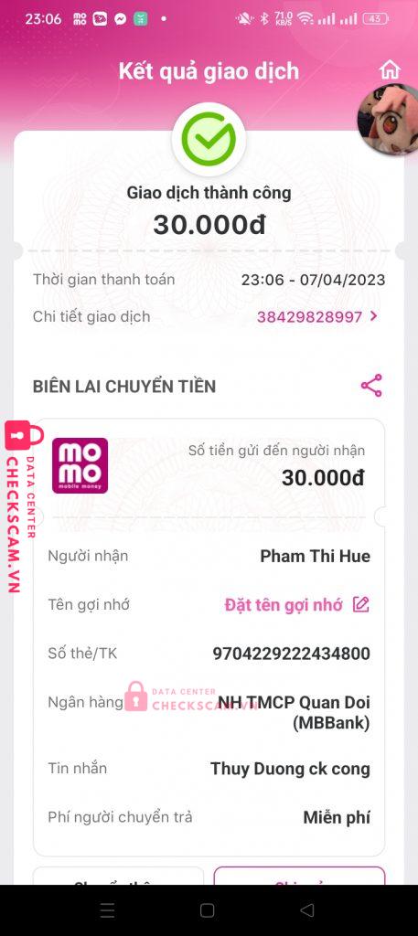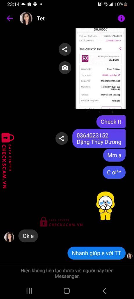 Scammer Alert: Pham Thi Hue Reported: November 16, 2024 Scammer Information Full Name: Pham Thi Hue Payment Gate: MB Bank Payment Account: 9704229222434800 Category: Marketplace scams Source: Checkscam Evidence Files Report Description Scam tiền goods, gửi bill liền block và không liên lạc lại, không gửi hàng cho buyer Comments Your comment Add Comment No comments yet. Be the first to share your experience with this scammer.
