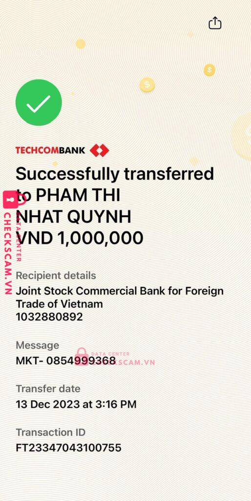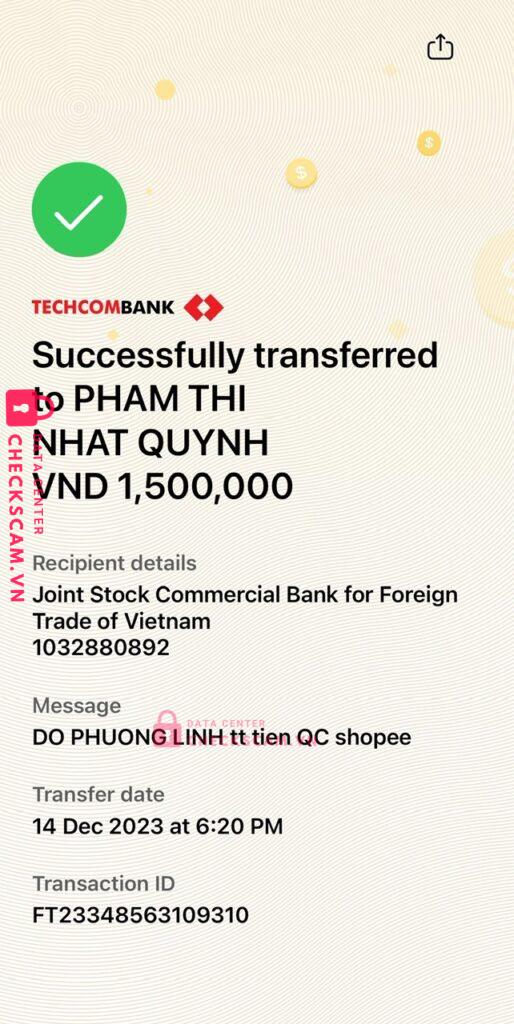 Scammer Alert: Pham Thi Nhat Quynh Reported: November 16, 2024 Scammer Information Full Name: Pham Thi Nhat Quynh Payment Gate: Vietcombank Payment Account: 1032880892 Category: Marketplace scams Source: Checkscam Evidence Files Report Description Comments Your comment Add Comment No comments yet. Be the first to share your experience with this scammer.