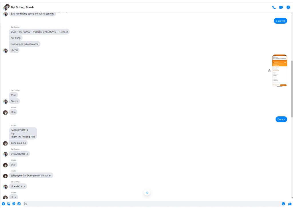 Scammer Alert: Pham Thi Phuong Hoa Reported: November 16, 2024 Scammer Information Full Name: Pham Thi Phuong Hoa Payment Gate: Agri bank Payment Account: 3402205303819 Category: Marketplace scams Source: Checkscam Evidence Files Report Description Súc vật bán scan vừa done trung gian back tk về: ID TK 120767908313519 Comments Your comment Add Comment No comments yet. Be the first to share your experience with this scammer.