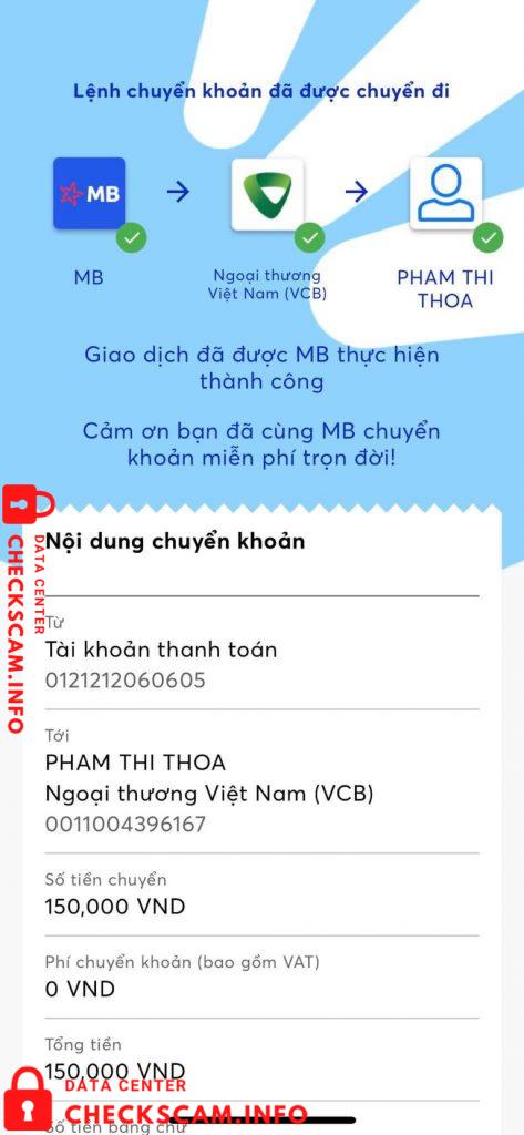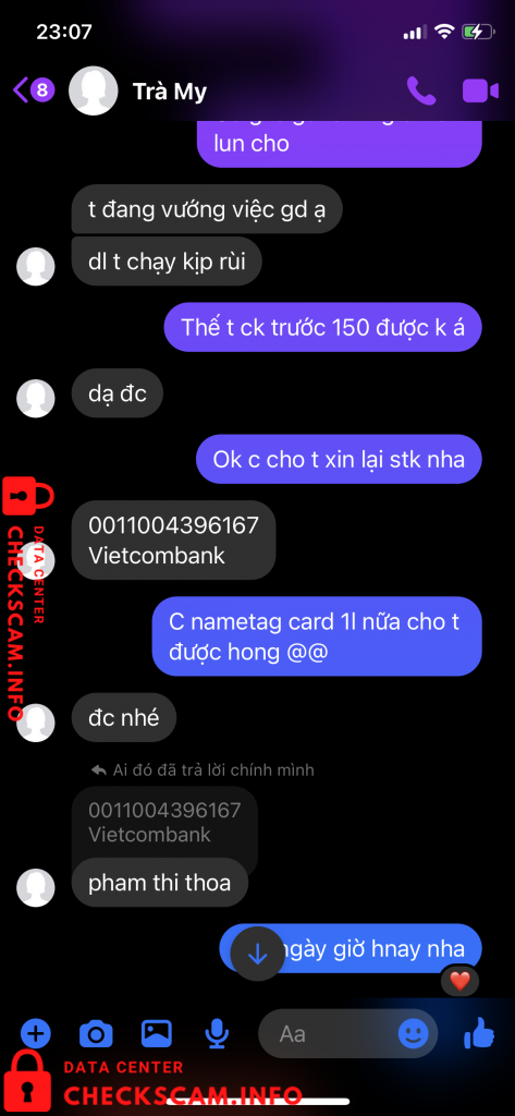 Scammer Alert: Pham Thi Thoa Reported: November 16, 2024 Scammer Information Full Name: Pham Thi Thoa Payment Gate: Vietcombank Payment Account: 0011004396167 Category: Marketplace scams Source: Checkscam Evidence Files Report Description Tóm gọn là stk này sử dụng để lừa đảo ạ Comments Your comment Add Comment No comments yet. Be the first to share your experience with this scammer.