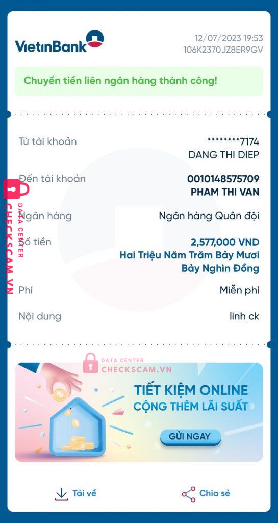 Scammer Alert: Pham Thi Van Reported: November 16, 2024 Scammer Information Full Name: Pham Thi Van Payment Gate: mb Payment Account: 0010148575709 Category: Marketplace scams Source: Checkscam Evidence Files Report Description mình đổi tệ xong con mẹ này scam m luôn Comments Your comment Add Comment No comments yet. Be the first to share your experience with this scammer.