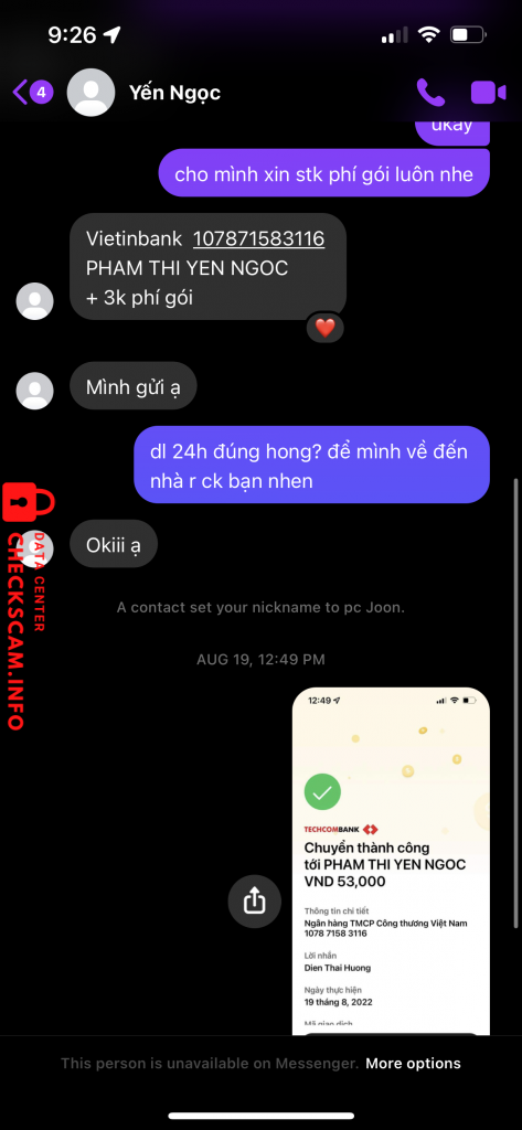 Scammer Alert: Pham Thi Yen Ngoc Reported: November 16, 2024 Scammer Information Full Name: Pham Thi Yen Ngoc Payment Gate: Vietinbank Payment Account: 107871583116 Category: Marketplace scams Source: Checkscam Evidence Files Report Description Comments Your comment Add Comment No comments yet. Be the first to share your experience with this scammer.