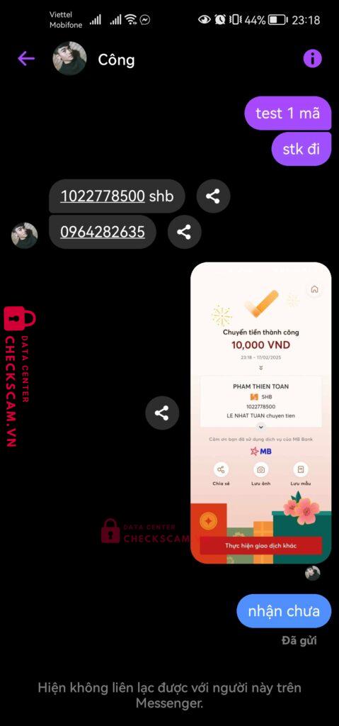 Scammer Alert: PHAM THIEN TOAN Reported: March 7, 2025 Scammer Information Full Name: PHAM THIEN TOAN Payment Gate: SHB Payment Account: 1022778500 Category: Marketplace scams Source: Checkscam Evidence Files Report Description scam otp shope Comments Your comment Add Comment No comments yet. Be the first to share your experience with this scammer.