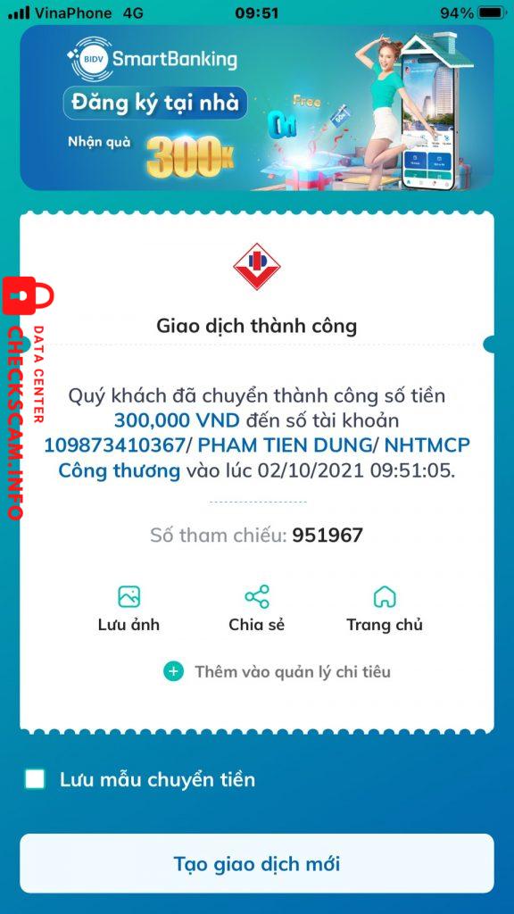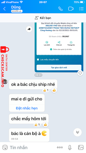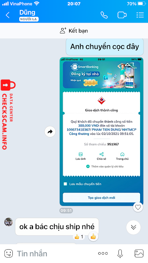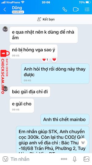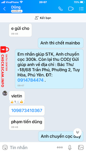 Scammer Alert: Phạm Tiến Dũng Reported: November 16, 2024 Scammer Information Full Name: Phạm Tiến Dũng Payment Gate: Vietinbank Payment Account: 109873410367 Category: Marketplace scams Source: Checkscam Evidence Files Report Description Đăng bán latop trên Chotot.com . Lừa khách hàng đặt cọc để chiếm đoạt Comments Your comment Add Comment No comments yet. Be the first to share your experience with this scammer.
