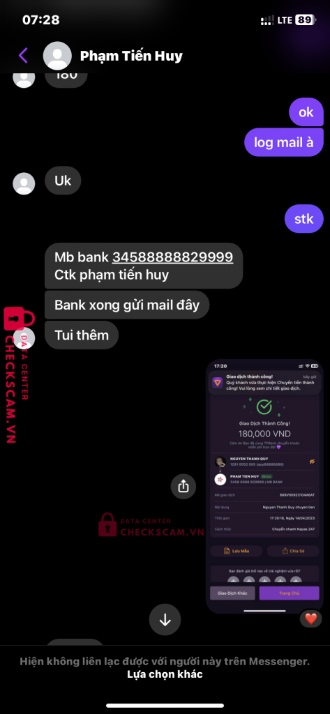 Scammer Alert: Phạm Tiến Huy Reported: November 16, 2024 Scammer Information Full Name: Phạm Tiến Huy Payment Gate: Mb bank Payment Account: 34588888829999 Category: Marketplace scams Source: Checkscam Evidence Files Report Description Scam buôn bán acc Tiktok Comments Your comment Add Comment No comments yet. Be the first to share your experience with this scammer.