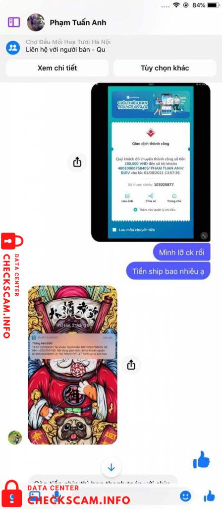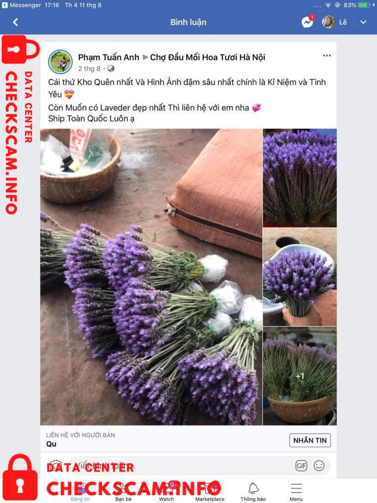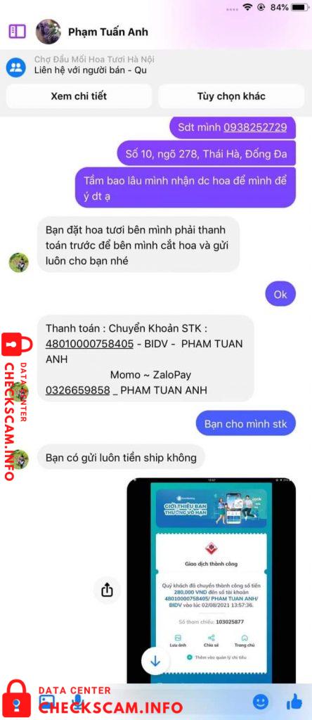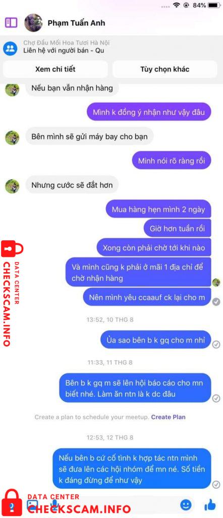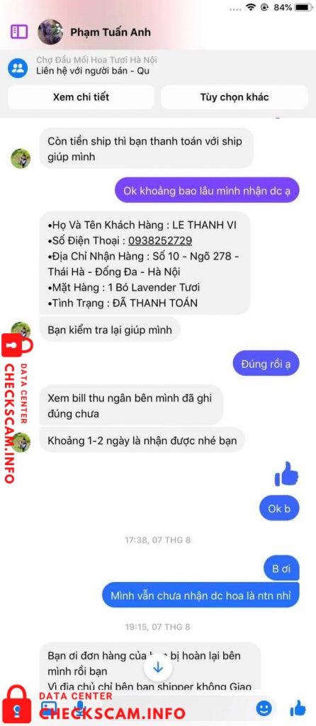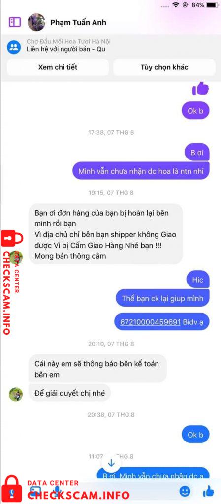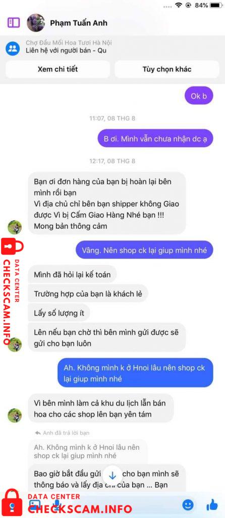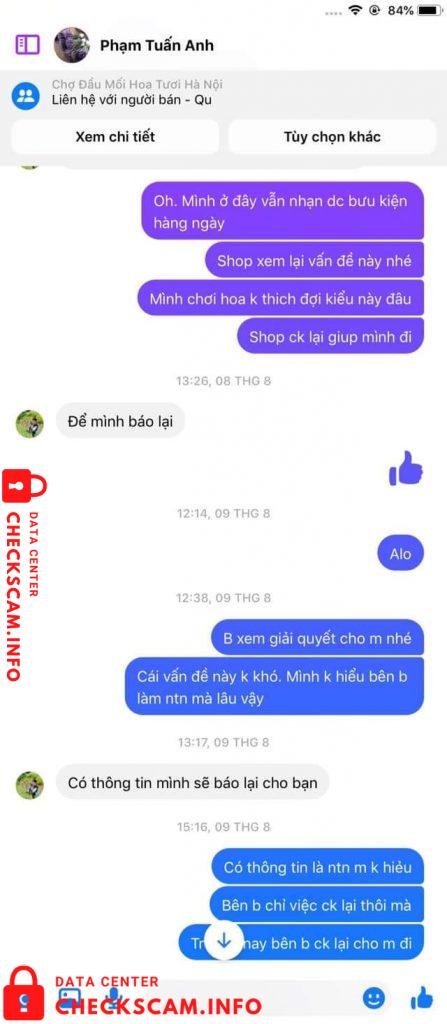 Xin phép Ad và mọi người. Mình đã đợi để mong nhận được sự hợp tác từ phía bạn này nhưng vẫn không được phản hồi khiến mình rất bức xúc. Đã tròn 1 tháng rồi nhưng bên bạn này vẫn quanh co cố tình và lờ đi luôn. Đặt hoa yêu cầu chuyển khoản trước mình cũng vui vẻ hợp tác, xong còn đòi ck luôn cả phí ship cơ. Dịch dã hỗ trợ nhau không hết lại đi lừa đảo ntn. Mình mong Ad duyệt bài để tránh những trường hợp bị lừa mất tiền oan như mình. Số tiền không lớn nhưng nếu nhiều người cộng lại là cả vấn đề. Cả nhà né ra ạ