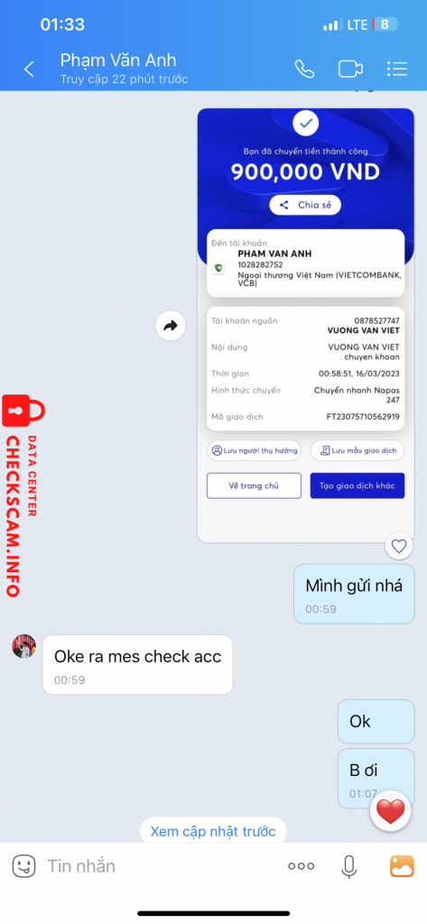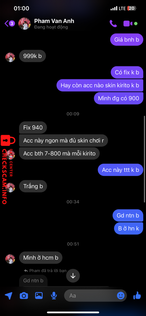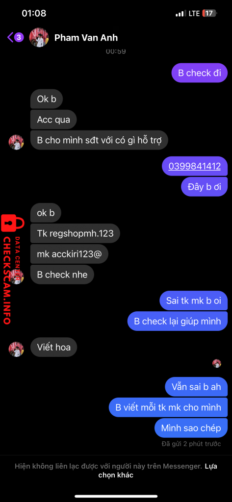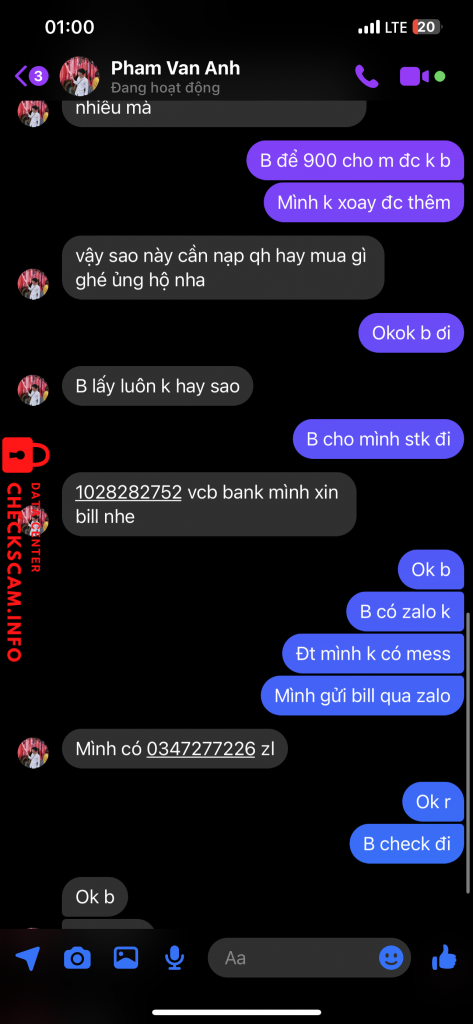 Scammer Alert: Phạm Văn Anh Reported: November 16, 2024 Scammer Information Full Name: Phạm Văn Anh Phone Number: 0347277226 Payment Gate: Vietcombank Payment Account: 1028282752 Category: Marketplace scams Source: Checkscam Evidence Files Report Description Scam mng né nhé Comments Your comment Add Comment No comments yet. Be the first to share your experience with this scammer.