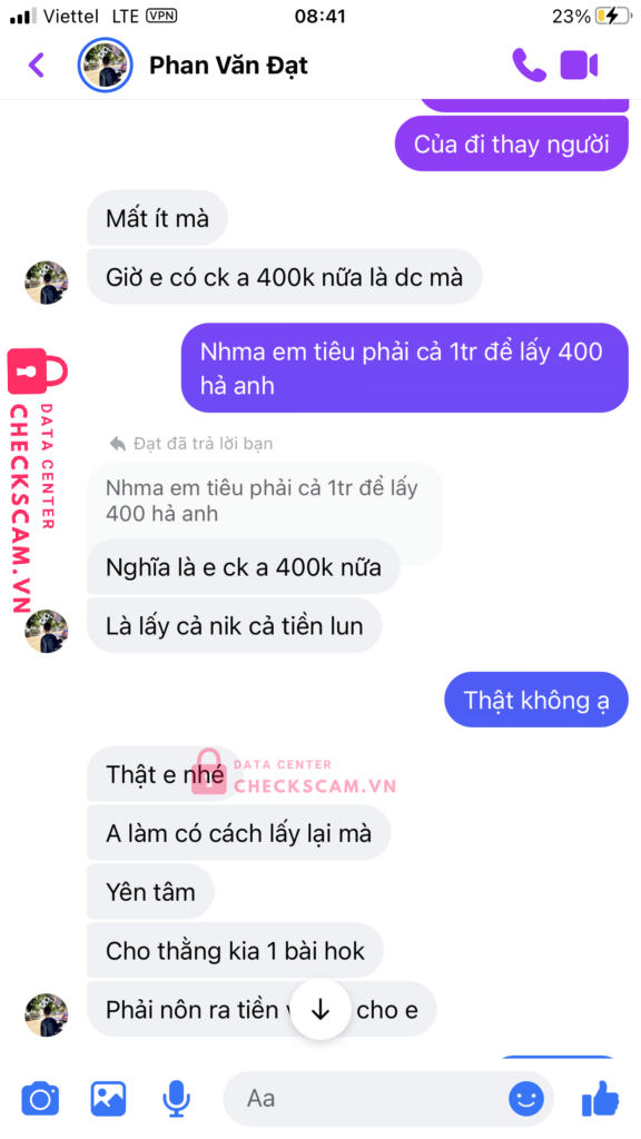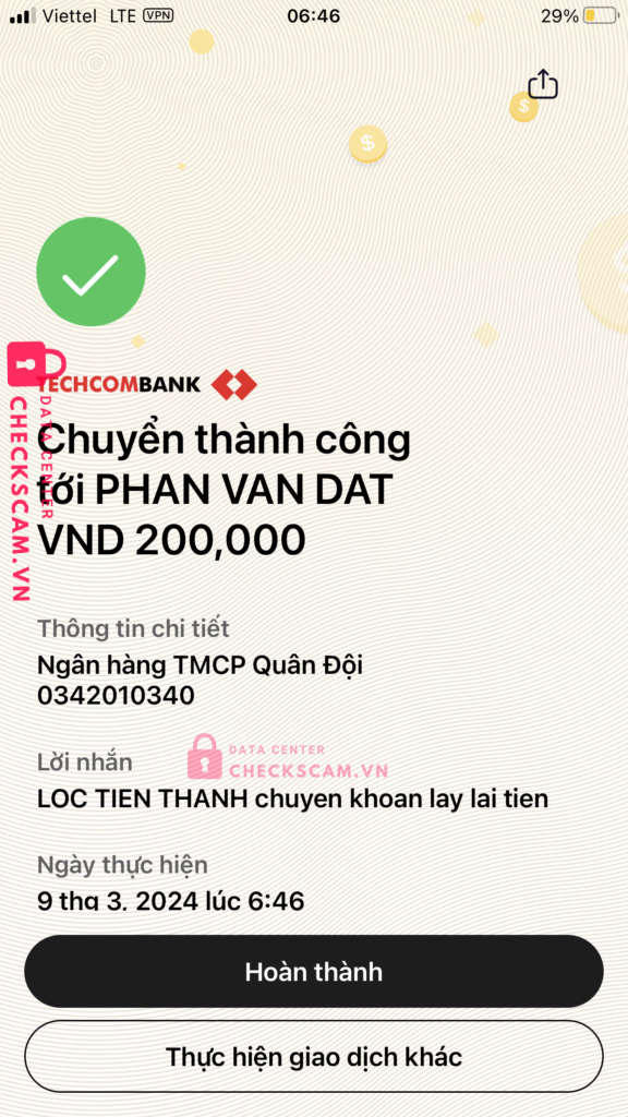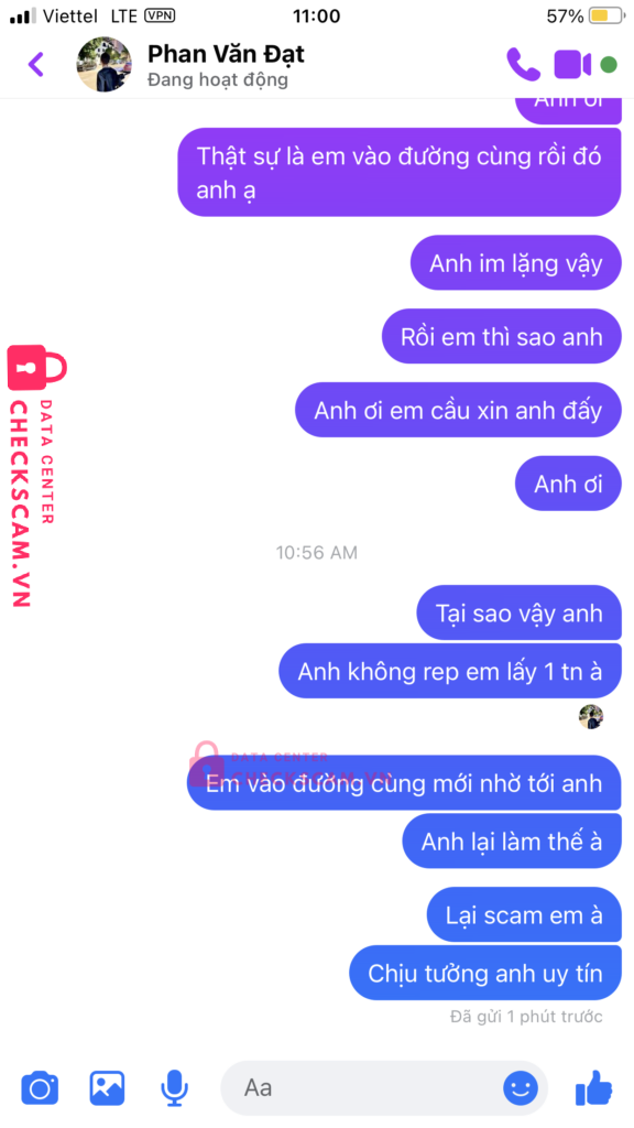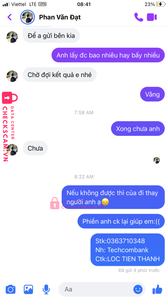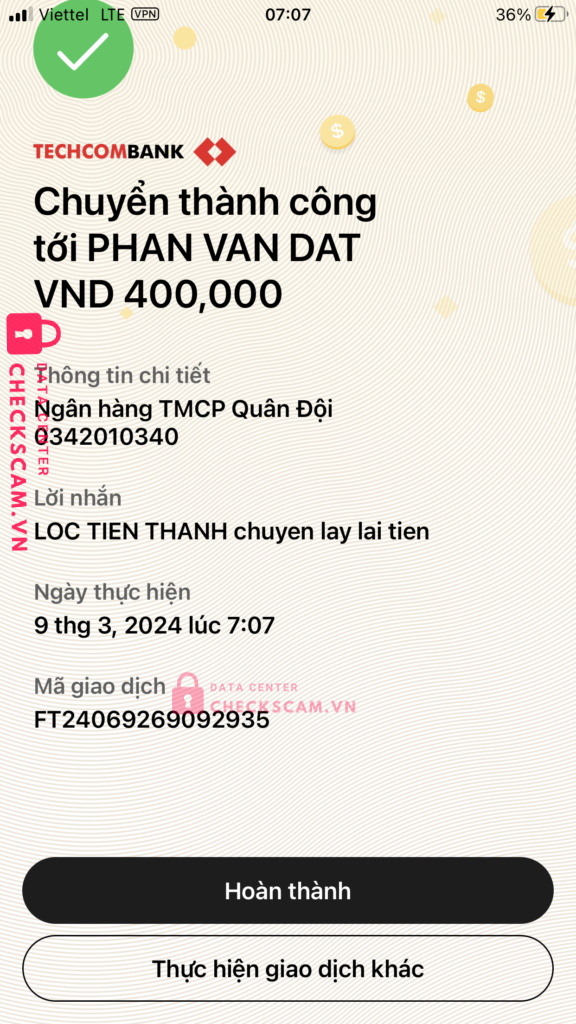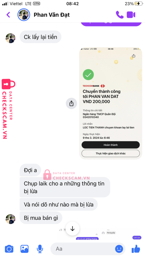 Scammer Alert: PHẠM VĂN ĐẠT Reported: November 16, 2024 Scammer Information Full Name: PHẠM VĂN ĐẠT Payment Gate: MB Bank Payment Account: 0342010340 Category: Marketplace scams Source: Checkscam Evidence Files Report Description Mình bị lừa lấy tiền khi nó bảo đưa đủ thì nó giao dịch cho mình chẳng biết nó nói thật hay đùa mà mình đưa cho nó tiền thế là nó lừa luôn Comments Your comment Add Comment No comments yet. Be the first to share your experience with this scammer.