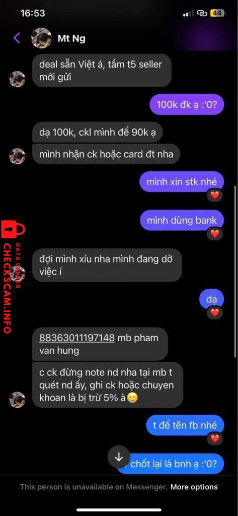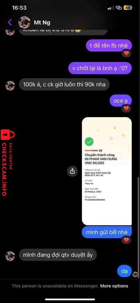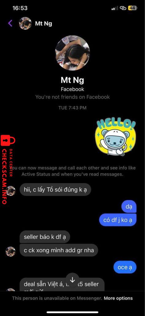 Ngày 28/2 tôi có nhắn tin mua hàng của bạn này ở trên group cộng đồng buôn bán. Sau khi ck đầy đủ (bạn này có bài check legit), bạn mới thông báo cho tôi biết đây là hàng oder theo G.O. nên bạn sẽ liên hệ với chủ gom để add tôi vào nhóm theo dõi tiến độ hàng hoá. Nhưng sang đến ngày hôm sau, tôi thấy bạn đã khoá fb nên tôi không thể liên hệ với bạn được. Vào ngày 6/3 bạn đã đổi tên (tên cũ: Hai Minh) sau khi mở lại fb nhưng tôi vẫn không thể liên lạc với bạn, vì vậy tôi đã phải sử dụng đến nick phụ. Tuy đã liên lạc được với bạn để giải quyết vấn đề nhưng thái độ của bạn như muốn trốn tránh, check hay rep tin nhắn rất chậm và hời hợt, thậm chí online thường xuyên nhưng vẫn cố tình lơ ib. Khi tôi cảnh báo sẽ đăng bài CBGD lên các group cộng đồng nếu bạn không giải quyết dứt điểm vấn đề sau một thời gian dây dưa quá dài, bạn đã chặn luôn nick phụ của tôi, đồng thời khoá fb tiếp.