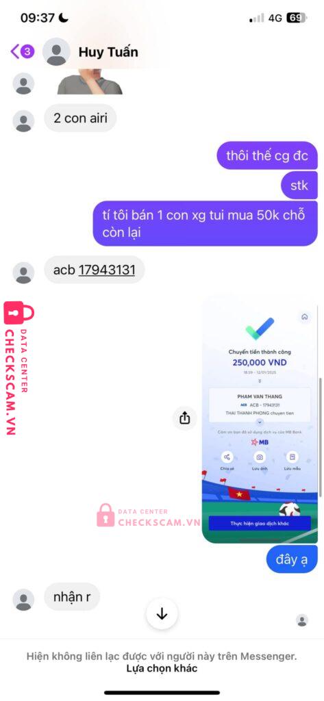 Scammer Alert: Phạm Văn Thắng Reported: March 7, 2025 Scammer Information Full Name: Phạm Văn Thắng Payment Gate: ACB Payment Account: 17943131 Category: Marketplace scams Source: Checkscam Evidence Files Report Description Bán acc liên quân nhưng lừa đáo Comments Your comment Add Comment No comments yet. Be the first to share your experience with this scammer.