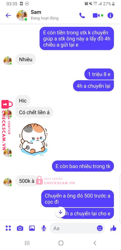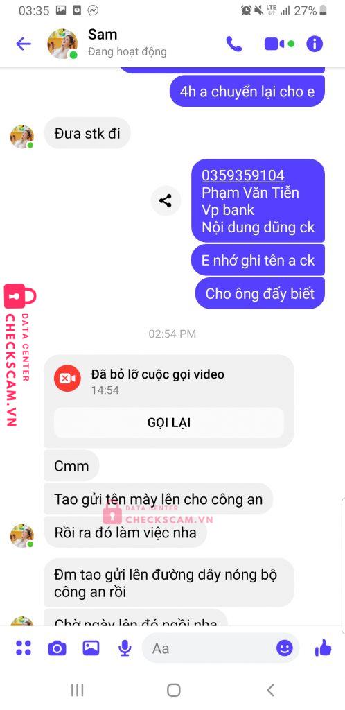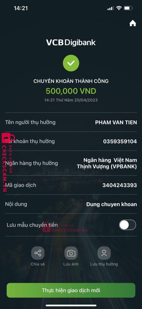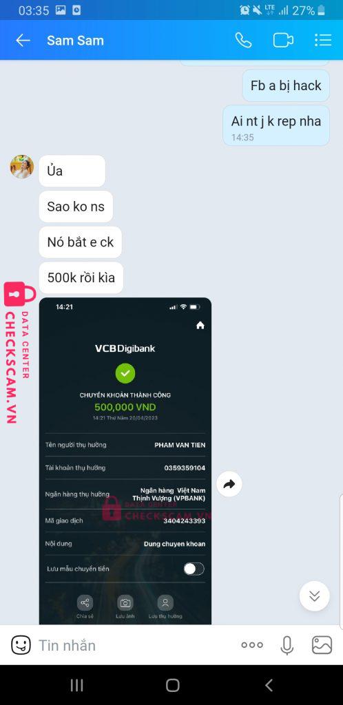 Scammer Alert: Phạm Văn Tiễn Reported: November 16, 2024 Scammer Information Full Name: Phạm Văn Tiễn Phone Number: 0359359104 Payment Gate: Vpbank Payment Account: 0359359104 Category: Marketplace scams Source: Checkscam Evidence Files Report Description Phạm Văn Tiễn. Hack Facebook cá nhân của Dung tran để lừa đảo chiếm đoạt tài sản Comments Your comment Add Comment No comments yet. Be the first to share your experience with this scammer.