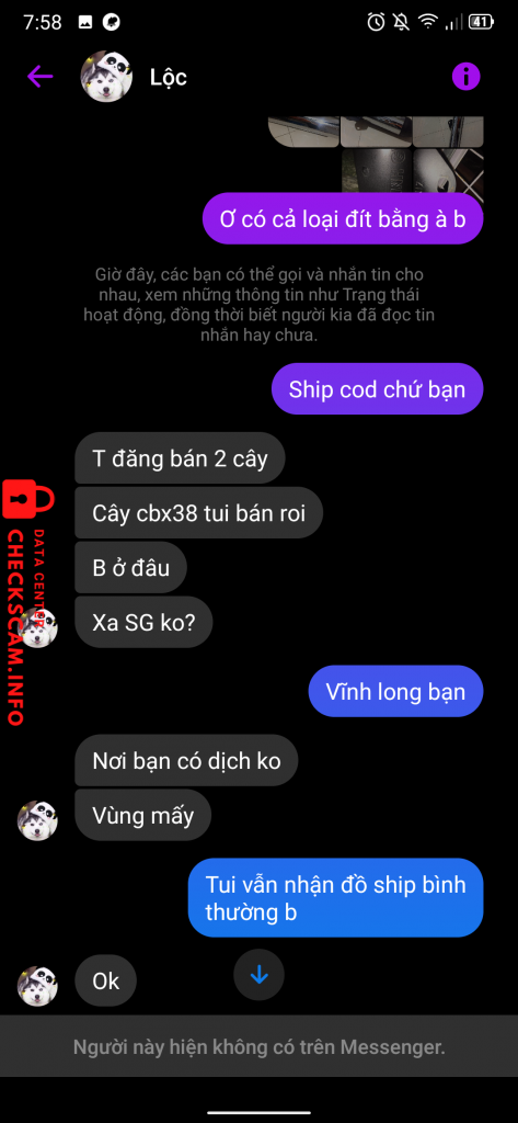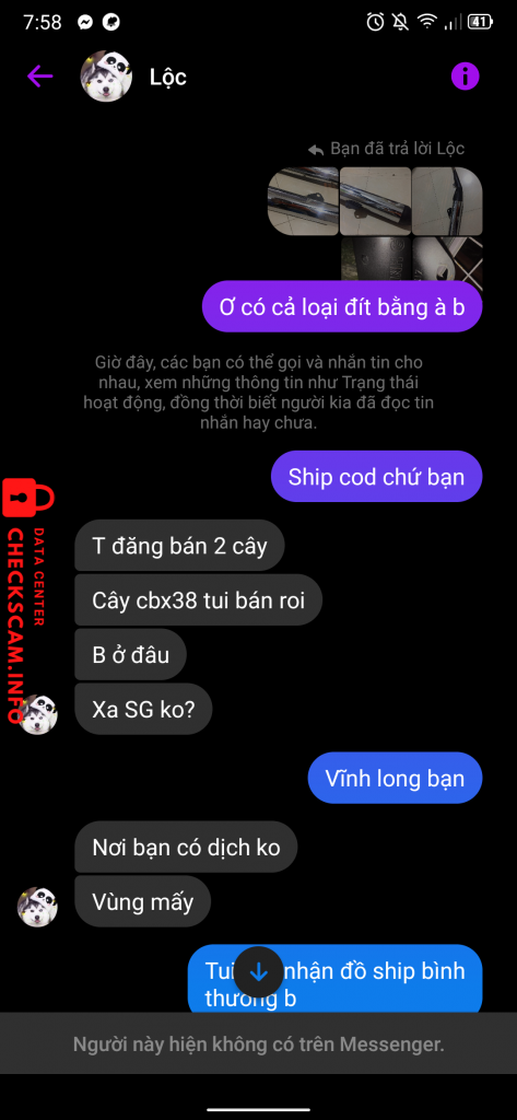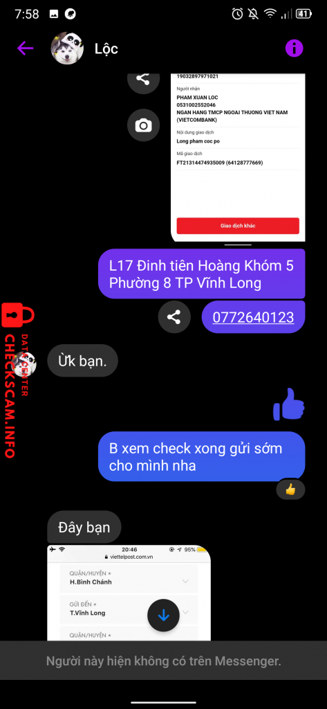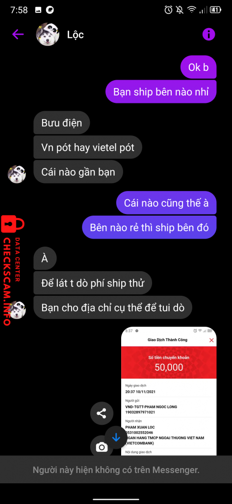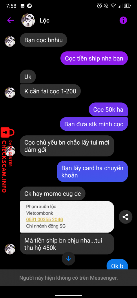 Scammer Alert: Phạm Xuân Lộc Reported: November 16, 2024 Scammer Information Full Name: Phạm Xuân Lộc Payment Gate: Vietcombank Payment Account: 0531002552046 Category: Marketplace scams Source: Checkscam Evidence Files Report Description Lừa cọc tiền ship Comments Your comment Add Comment No comments yet. Be the first to share your experience with this scammer.