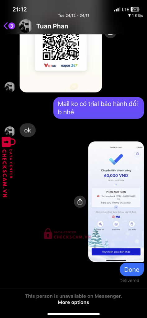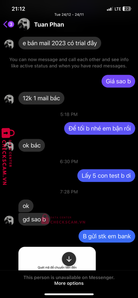 Scammer Alert: Phan Anh Tuan Reported: March 7, 2025 Scammer Information Full Name: Phan Anh Tuan Payment Gate: Techcombank Payment Account: 900022669999 Category: Marketplace scams Source: Checkscam Evidence Files Report Description Lừa đảo bán gmail, bank xong chặn Comments Your comment Add Comment No comments yet. Be the first to share your experience with this scammer.