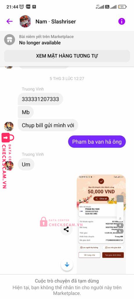 Scammer Alert: Phan Ba Van Reported: November 16, 2024 Scammer Information Full Name: Phan Ba Van Payment Gate: Mb bank Payment Account: 333331207333 Category: Marketplace scams Source: Checkscam Evidence Files Report Description Scam tiền cọc Comments Your comment Add Comment No comments yet. Be the first to share your experience with this scammer.