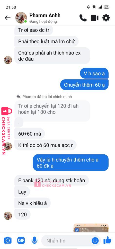 ban đầu mình mua acc 60k nhưng mình ghi sai nội dung sau đó nó bắt mình chuyển thêm 120 để hoàn 180 xong mình vẫn chuyển r nó nhưng nó vẫn kêu sai nd dù mình đã ghi nd theo nó sau nó mình vẫn sợ mất tiền kia và tin thêm lần nữa mình chuyển thêm 180k đã ghi đúng nd xong r nó lại sủa box nó kh hoàn tiền dưới 500 vcl thật nó lại đòi thêm 140 để nuốt thêm cho đủ