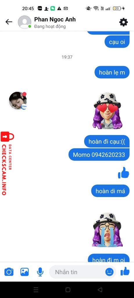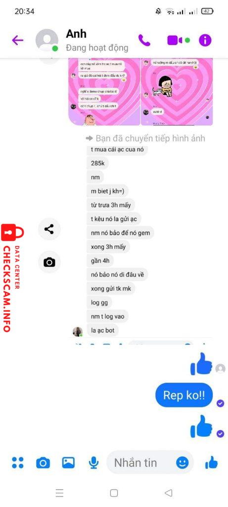 Scammer Alert: Phan Ngoc Anh Reported: November 16, 2024 Scammer Information Full Name: Phan Ngoc Anh Phone Number: 0348720068 Payment Gate: Momo Payment Account: 0348720068 Category: Marketplace scams Source: Checkscam Evidence Files Report Description Scam 685k mua acc free fire nt không rep Comments Your comment Add Comment No comments yet. Be the first to share your experience with this scammer.