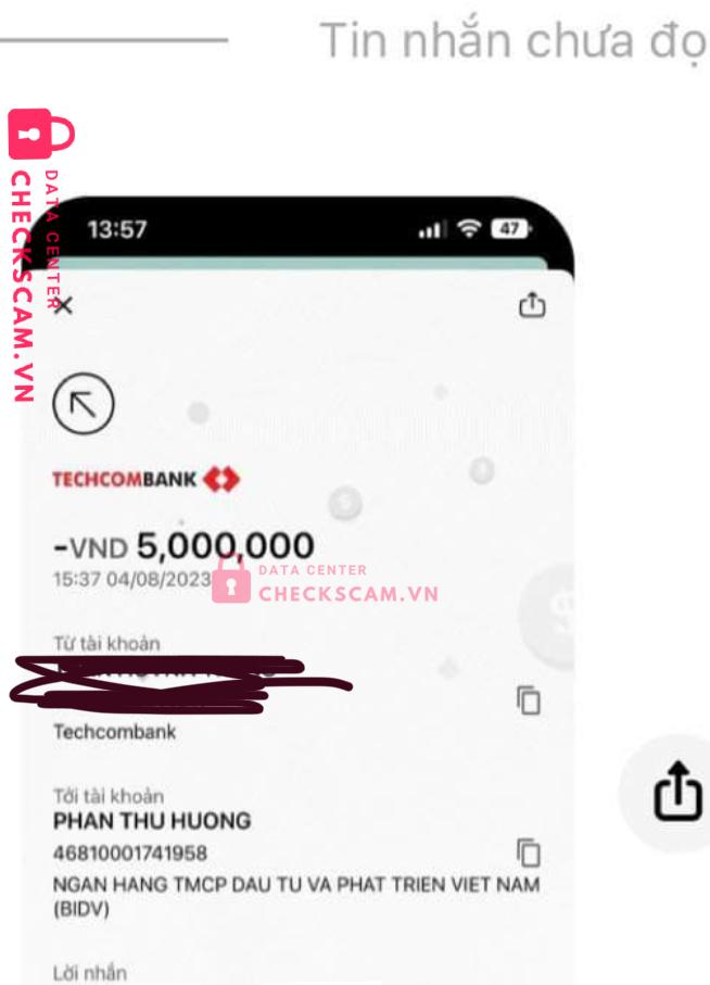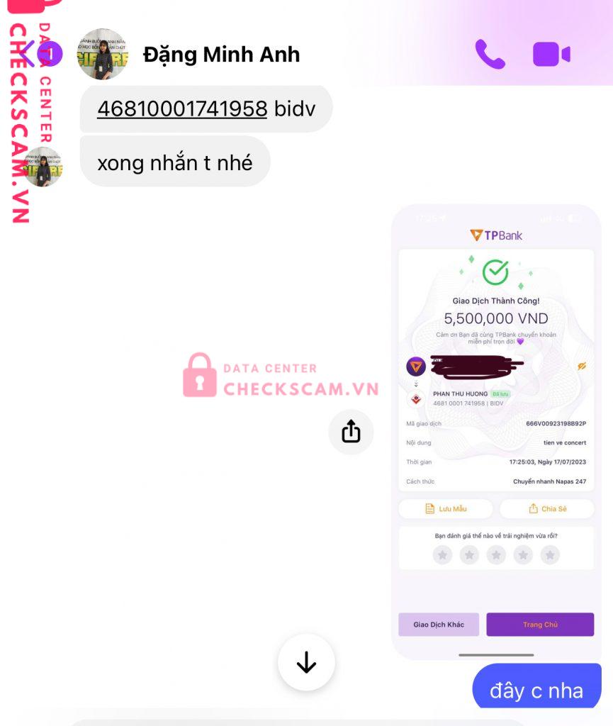 Ngày 17/7 mình có mua lại cặp vé của bạn Đặng Minh Anh (https://www.facebook.com/profile.php?id=100084000237715&mibextid=LQQJ4d), mình chuyển cọc 5tr5 (vào TK Phan Thu Huong STK BIDV 46810001741958), bạn hẹn sang Thái sẽ liên lạc rồi vào cùng vì bạn cũgn đi xem, thanh toán tại Thái. Sau đó mình liên lạc lại thì không được nữa.